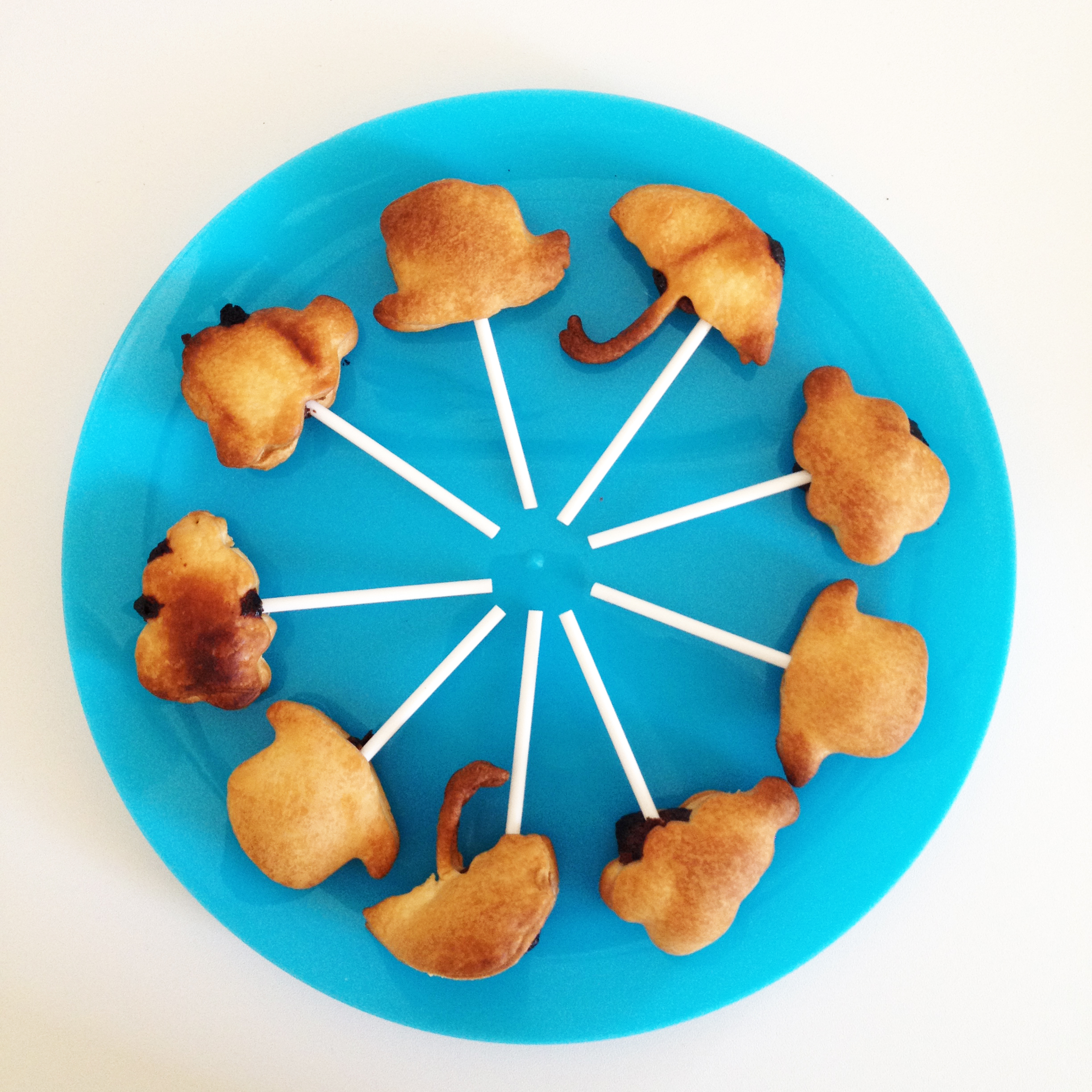 Étape 2 : Ajouter la garniture choisie au centre du morceau de pâte puis placer le bâtonnet (ici j’ai utilisé des cure-dents, tout aussi pratique !) pour enfin ajouter le deuxième morceau de pâte par-dessus.