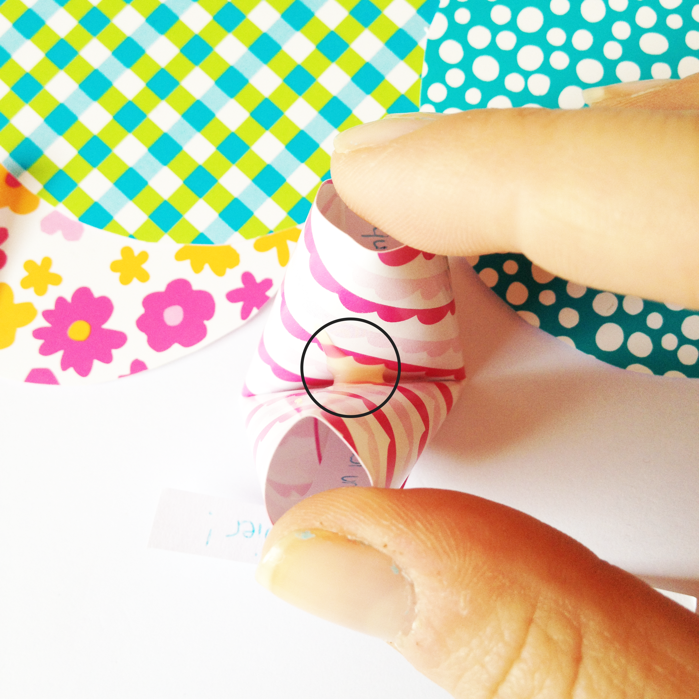 fortunecookies-13Étape facultative mais conseillée : Fixez votre pliage à l’aide d’un point de colle (au niveau du cercle noir sur la photo), cela facilitera le maintien de ce dernier. Laissez sécher et le tour est joué !