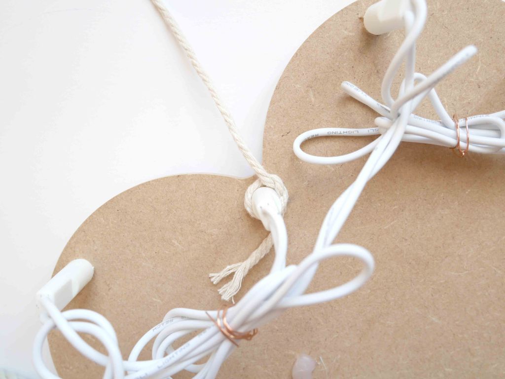 Astuce : Commencez par repérer l’extrémité de la guirlande, celle qui possède l’interrupteur, puis commencez par placer la 1ere led en bas du support et continuez ainsi en faisant le tour complet du support. - Une fois toutes les leds placées, «rangez» les différents câbles de la guirlande au dos du support. Pour cela, attachez-les ensemble à l’aide du fil de fer (ou autre).