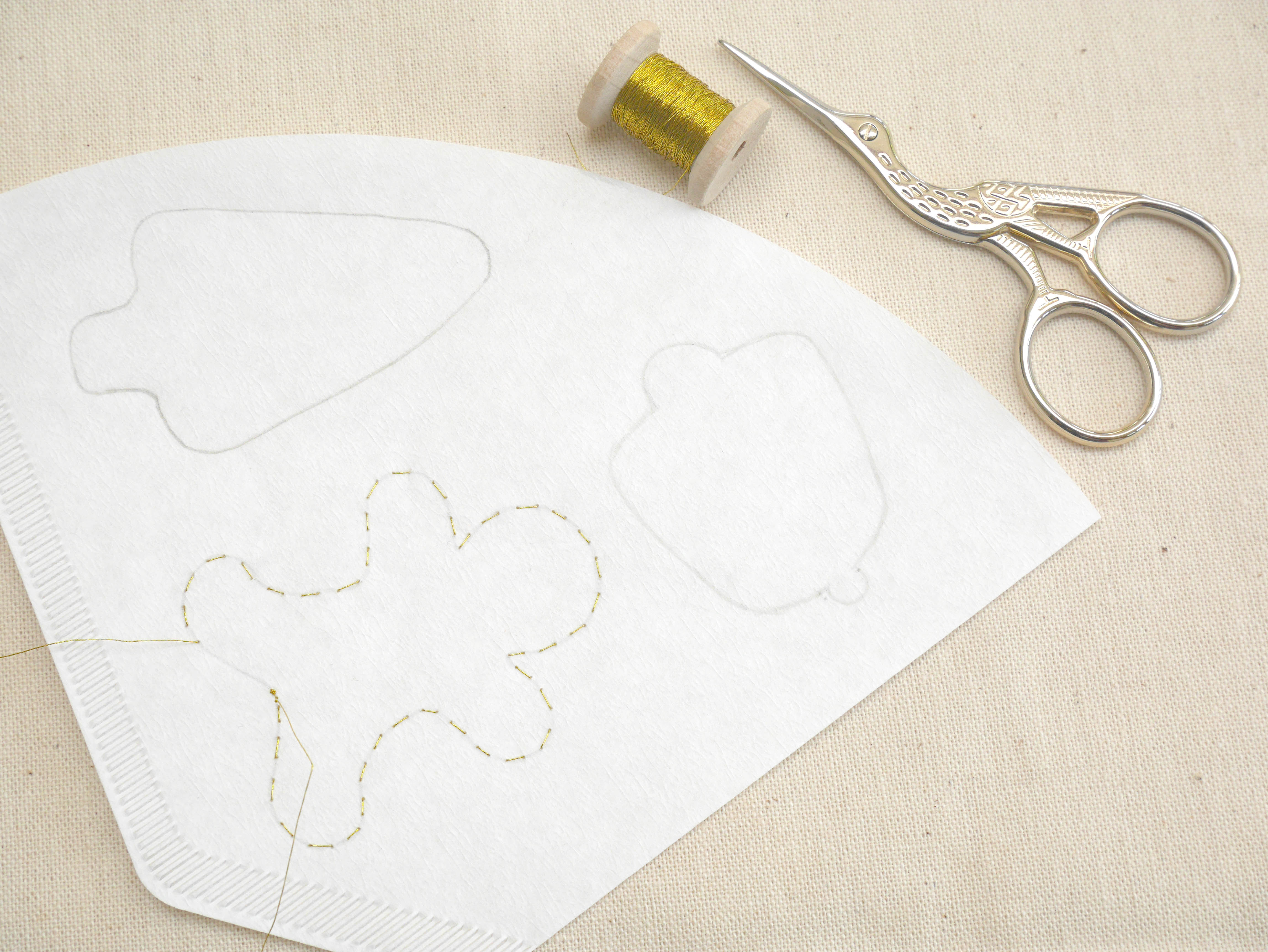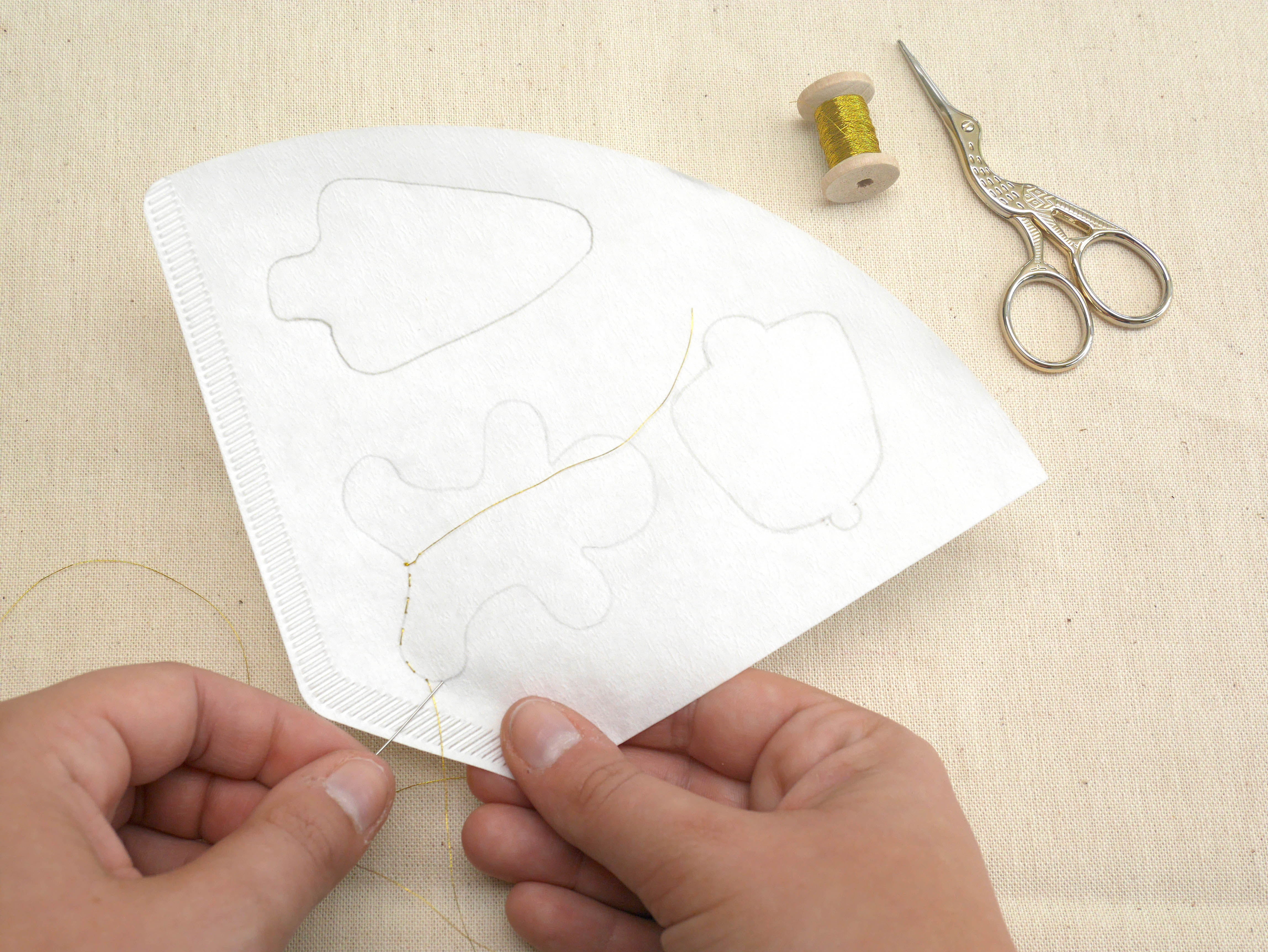 - Cousez ensuite tout autour de votre forme à l’aide de votre aiguille et du fil doré.