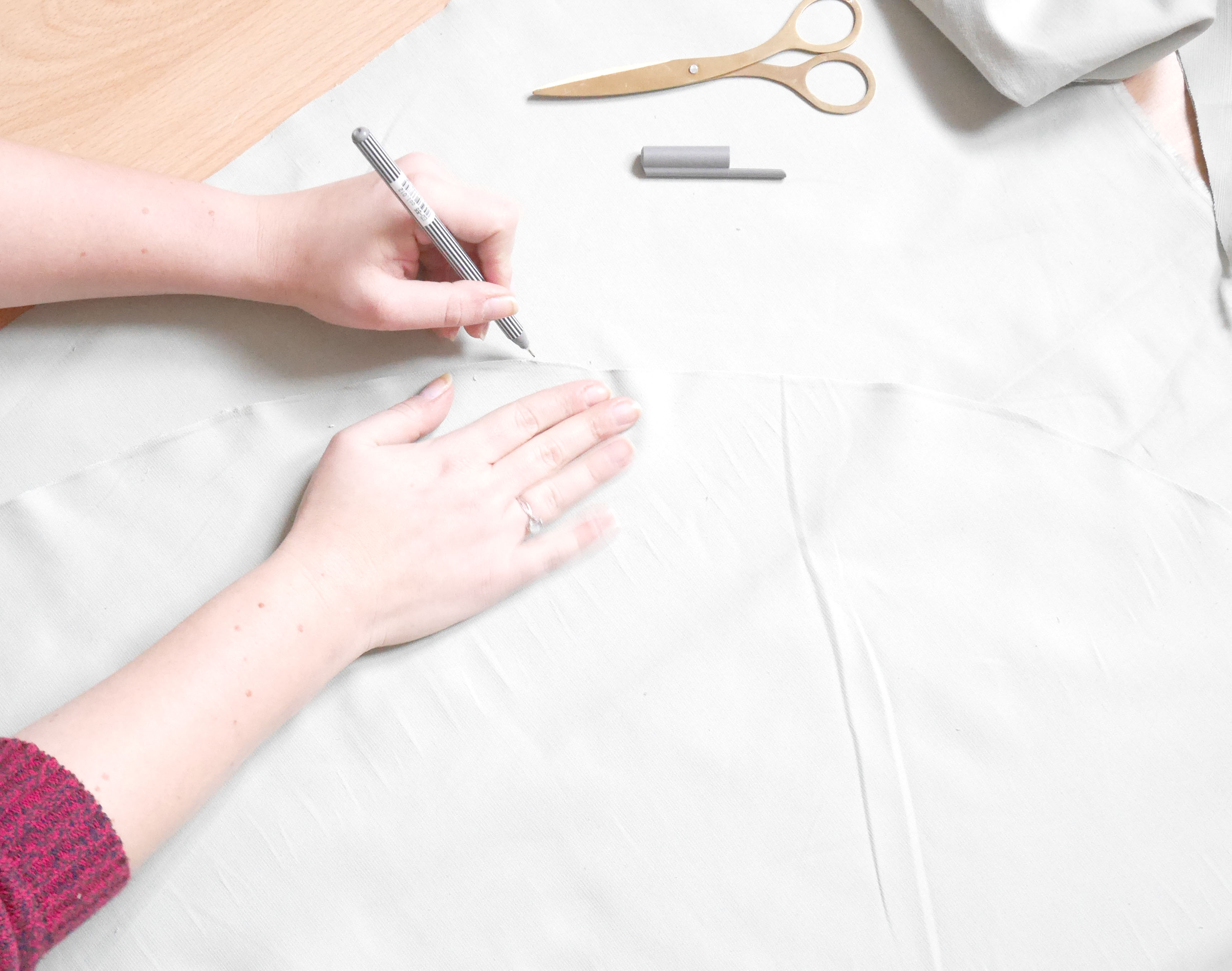 - Reportez cette mesure sur votre tissu. Pour ma version, j’ai un diamètre de 145 cm. Pour faciliter le tracé du cercle, pliez votre tissu en 4 puis dessiner un premier arc de cercle. Découpez-le puis reportez le tracé sur une autre partie du tissu. Faites ainsi afin d’obtenir un cercle parfait !