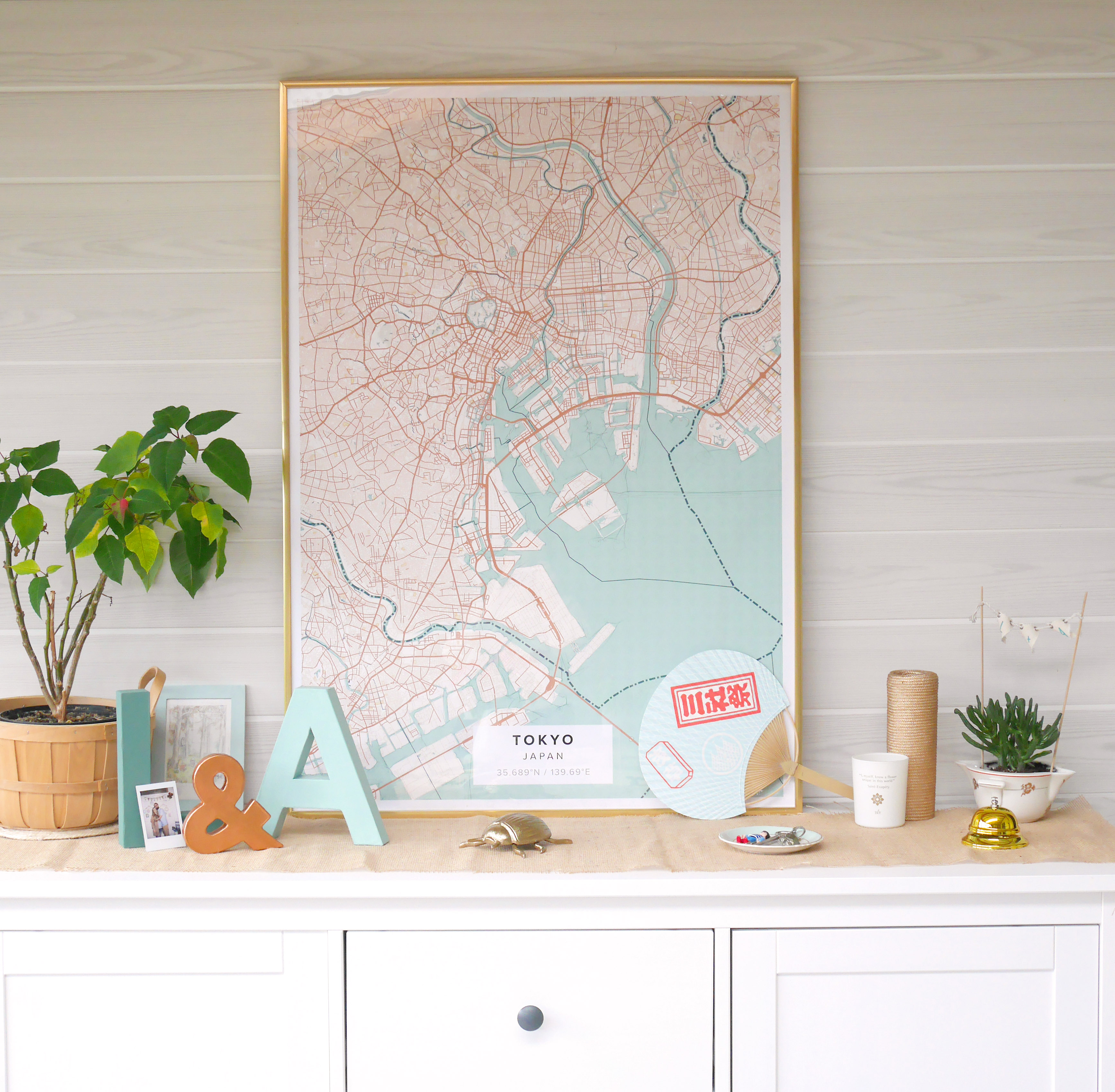 Je vous présente maintenant un nouvel élément déco qui a fait son apparition dans notre maison. Repéré il y a déjà un moment, le site web Mapiful vous propose d’imprimer des maps à partir de coordonnées GPS de votre chois, dans la taille et le style que vous souhaitez. Au moment du Black Friday, j’ai enfin craqué et j’ai choisi de faire imprimer en (très) grand format, un plan de la ville de Tokyo, en souvenir de notre plus beau voyage. La qualité d’impression est parfaite et le papier de très bonne qualité. Vous pouvez choisir l’option cadre mais n’ayant que du noir comme couleur j’ai préféré opter pour un cadre doré trouvé à Zodio. Qu’en pensez-vous ?