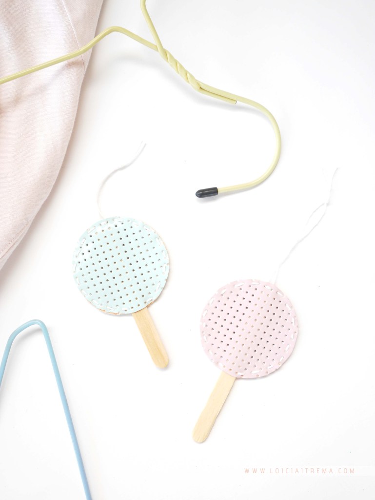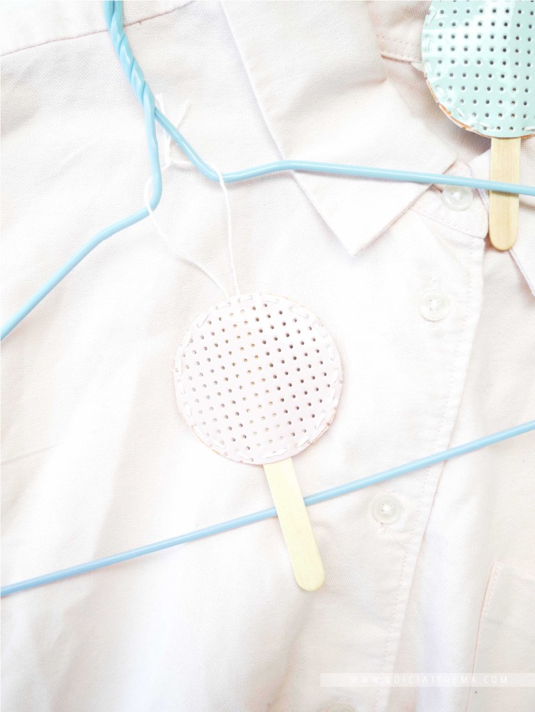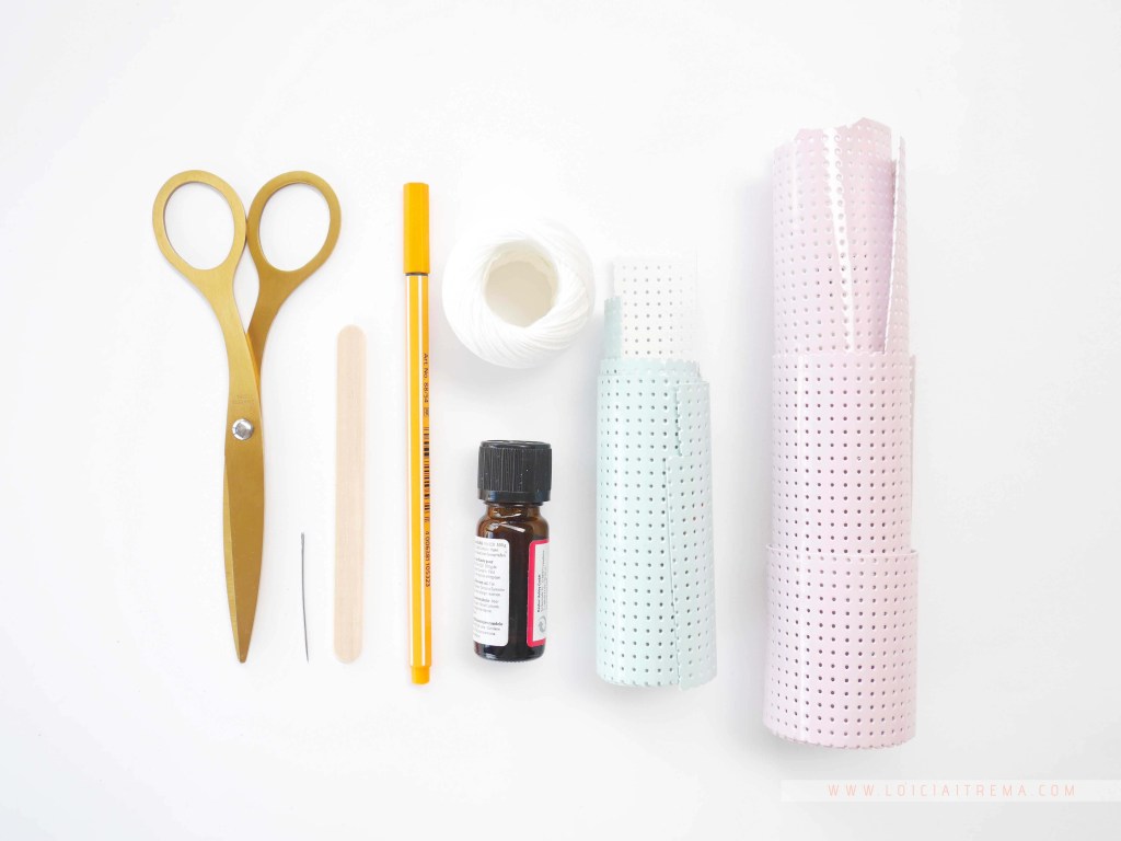 Ici, j’ai choisi d’utiliser du tissu vinyle perforé afin de garantir la diffusion du parfum de l’huile essentielle. De plus, son épaisseur permet de bien maintenir le désodorisant en place sans que l’humidité du bâtonnet en bois ne le déforme. Et en plus, cela donne un design très pop que j’adore ! ^^