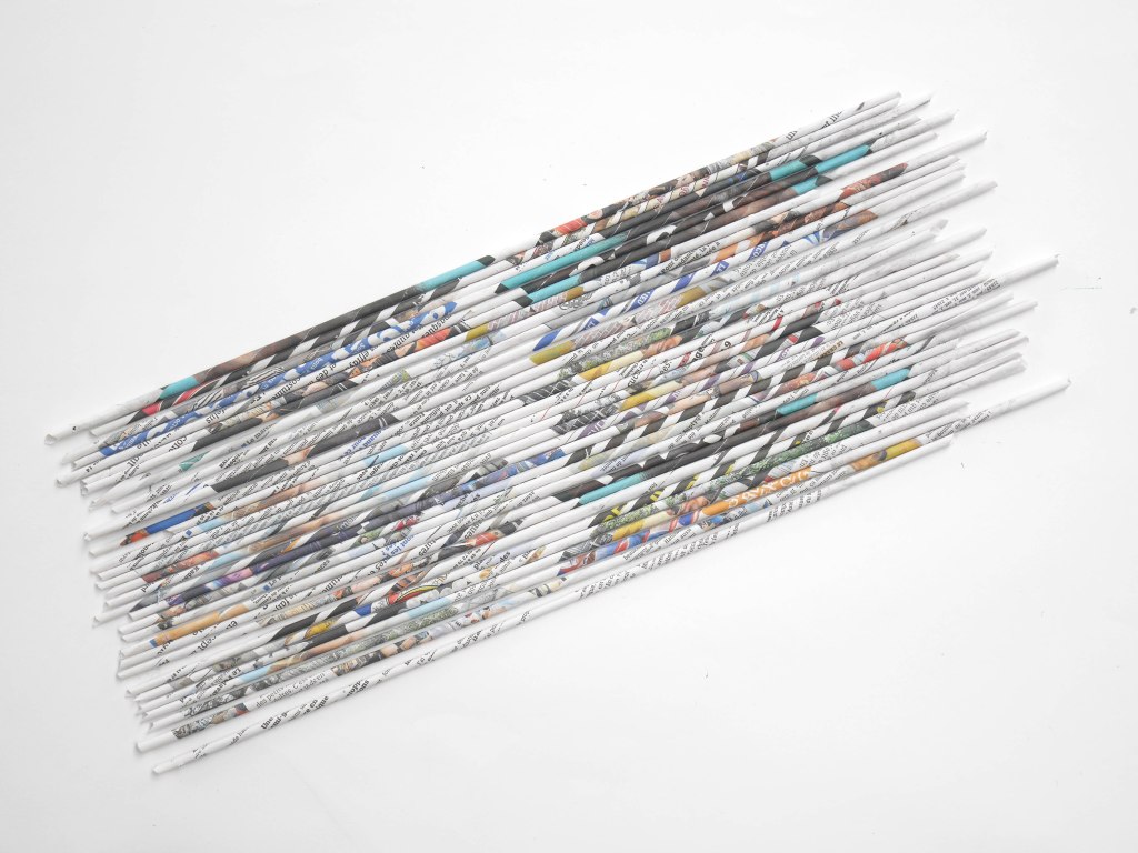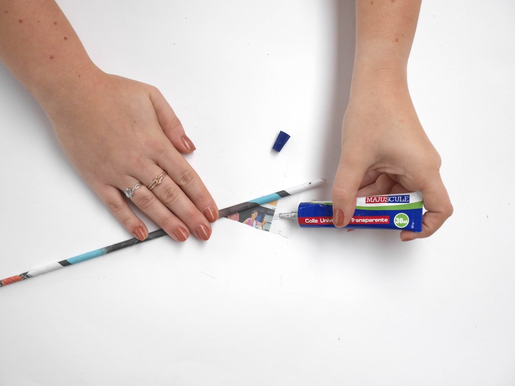 - Une fois toutes les bandes du journal enroulé, appliquez de la colle sur le dernier coin et sceller le tout. Retirez le stick puis continuez les étapes jusqu’à ce que vous ayez réalisé une soixantaine de « pailles » de journal. Ici, il en nécessitera plus ou moins selon la taille finale de votre panier.