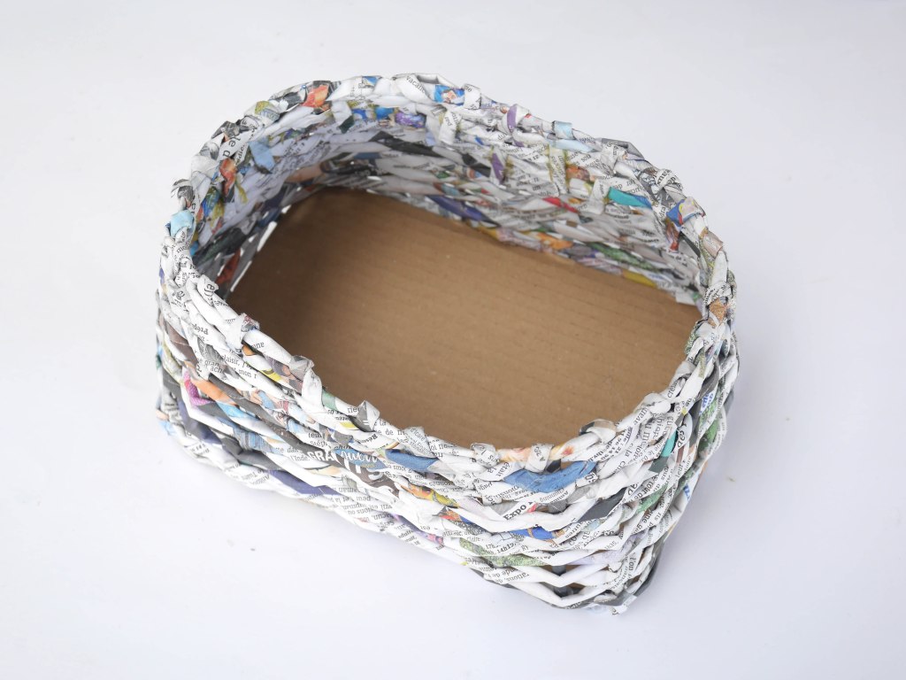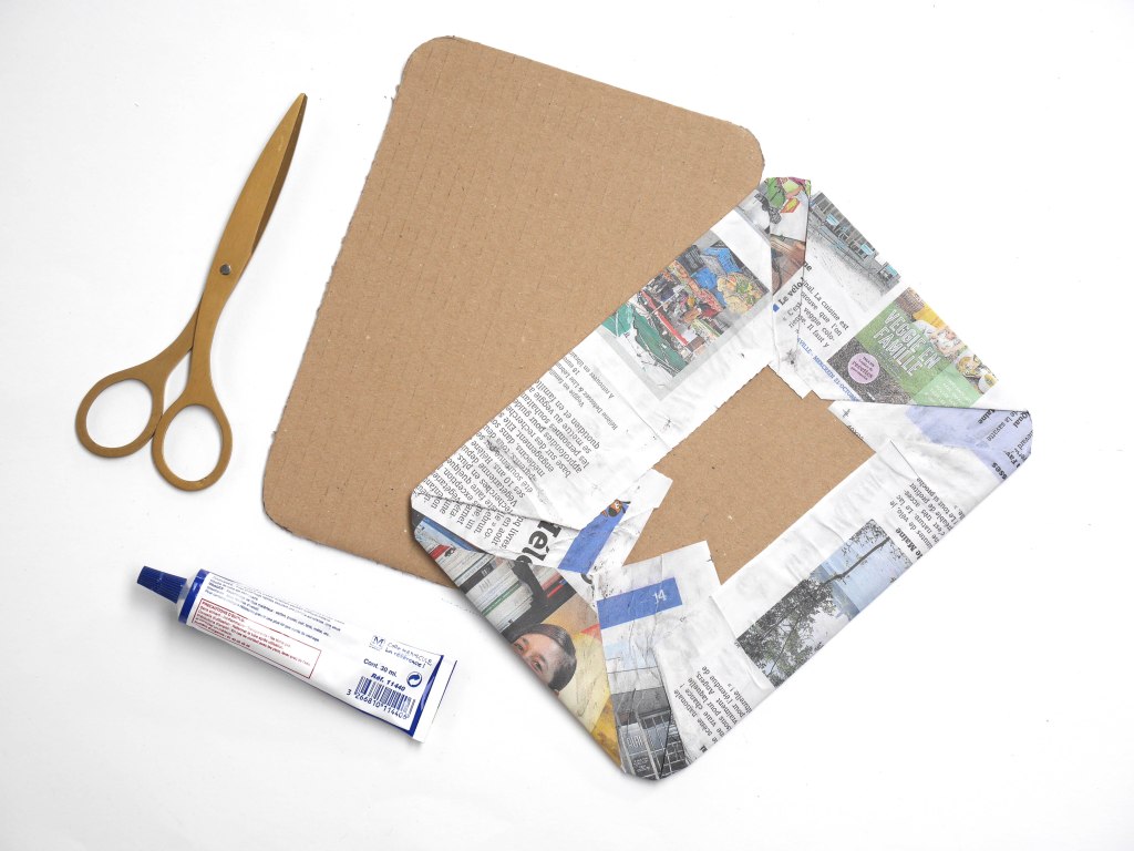 - Pour créer la base de la corbeille, coupez 2 morceaux de carton de 21×15 cm. Recouvrez-les de papier journal (facultatif).