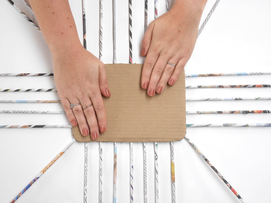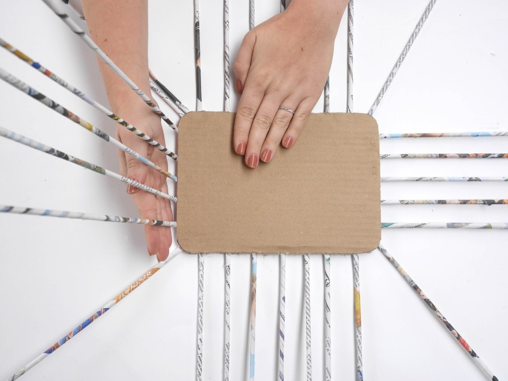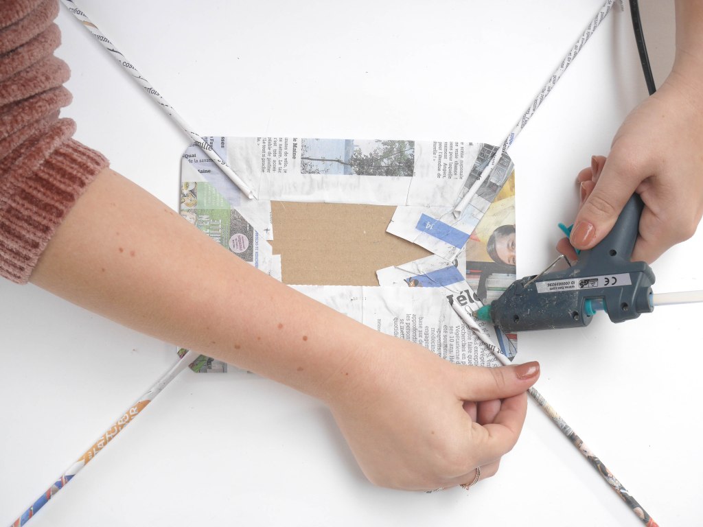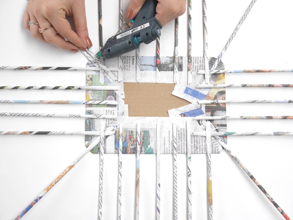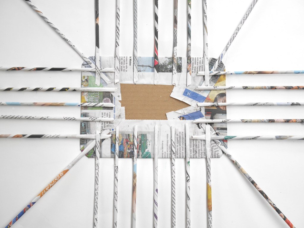 - Fixez l’autre partie de la base par dessous la première afin d’emprisonner les extrémités des « pailles » de papier. Laissez sécher l’ensemble avec de commencer le tissage.