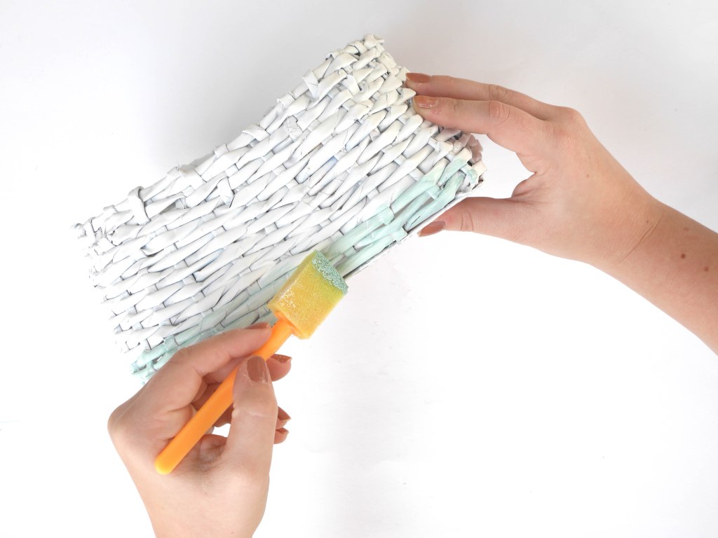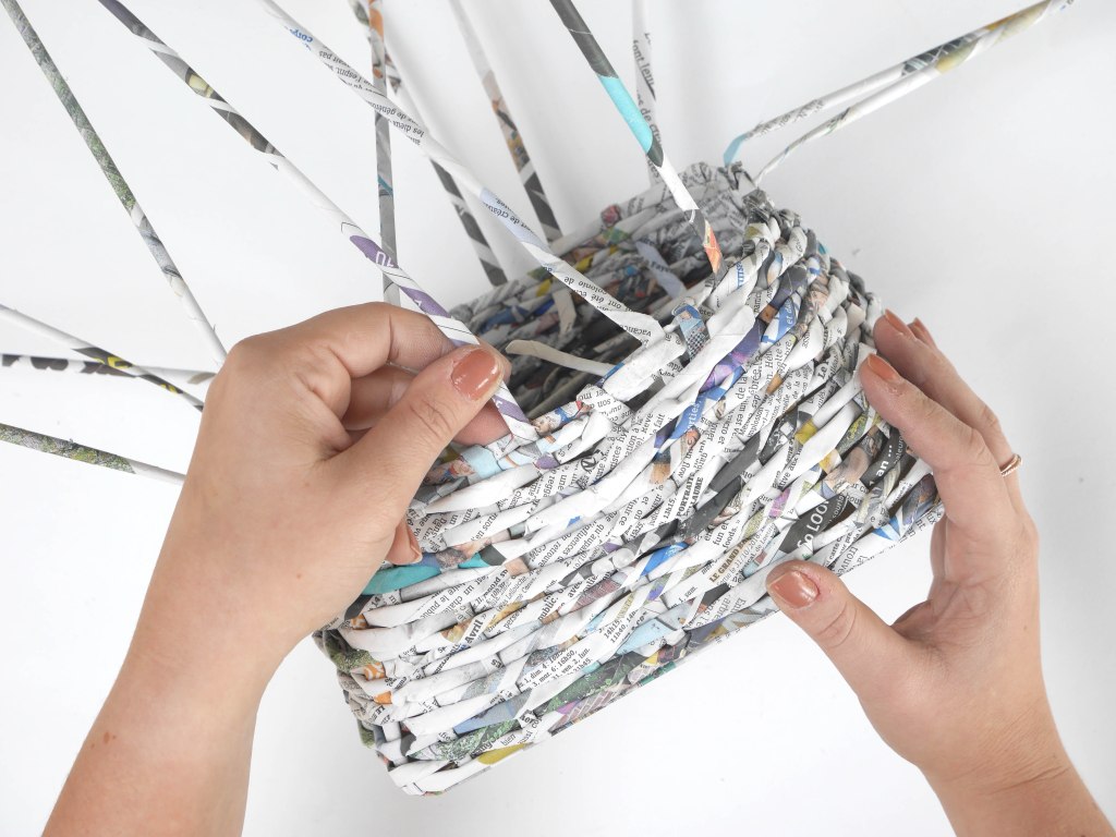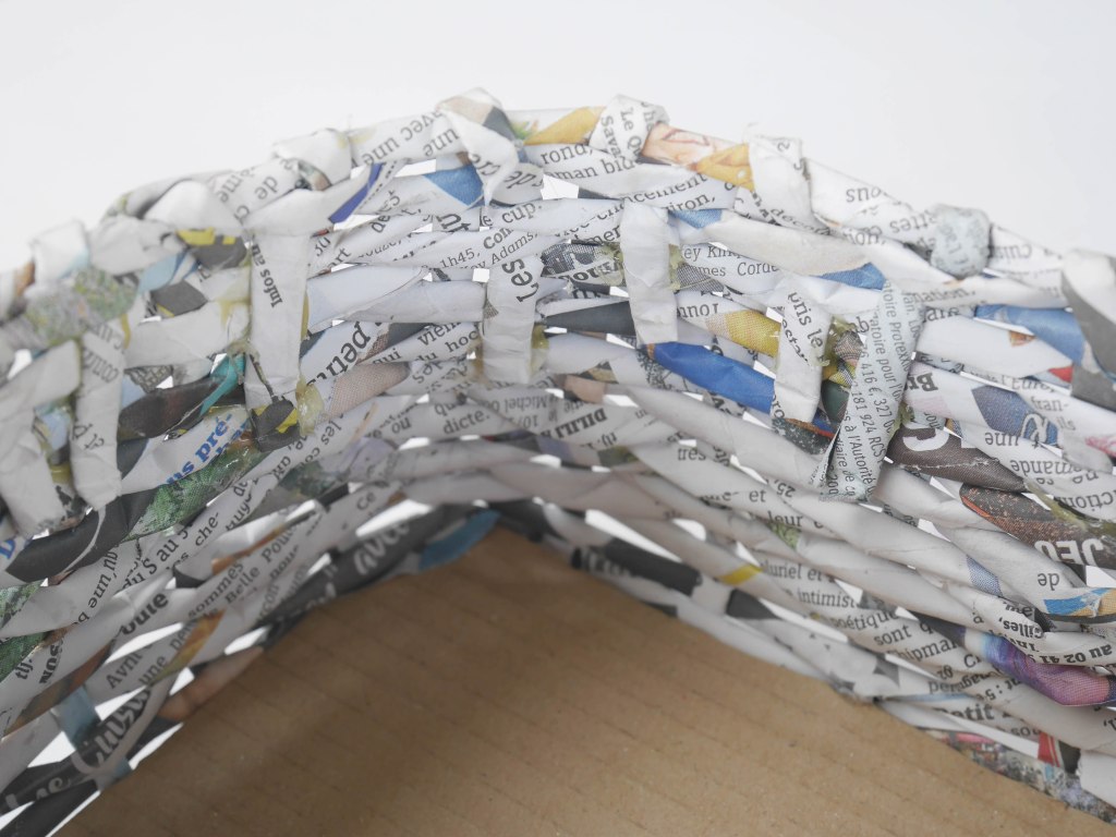 - Continuer le tissage sur une hauteur de 10 cm environ (plus ou moins selon vos envies). Astuce : Lorsque vous arrivez au bout de la « paille » en papier, insérez-en une autre dans la pointe en appliquant un peu de colle. Puis continuez le tissage)