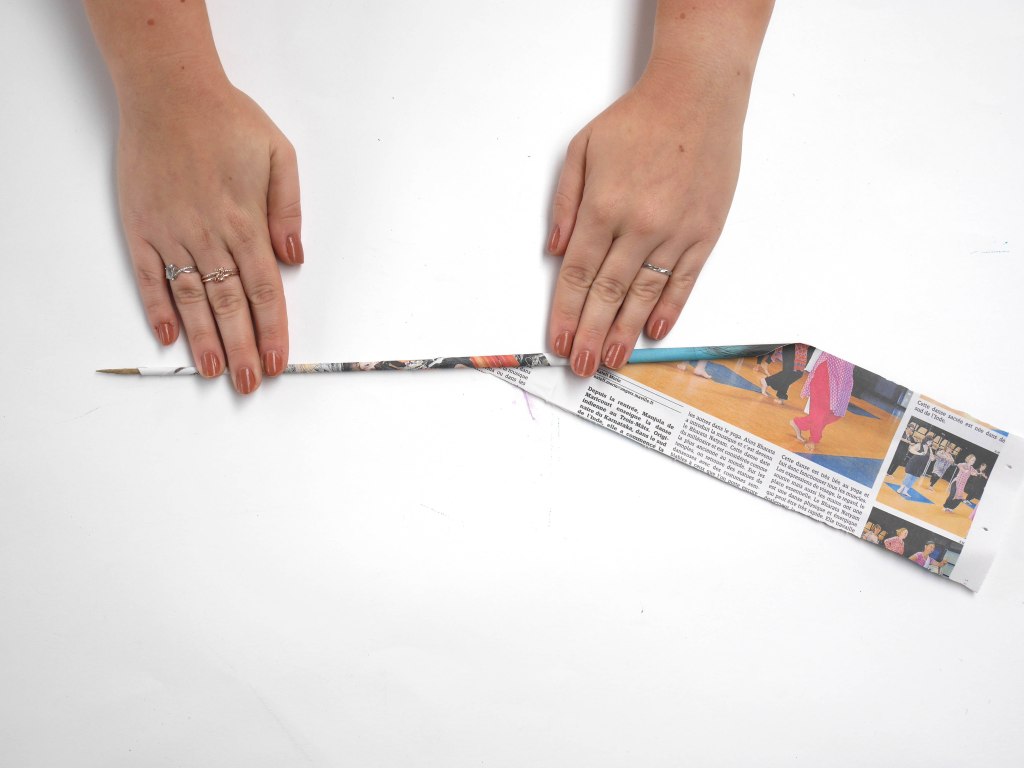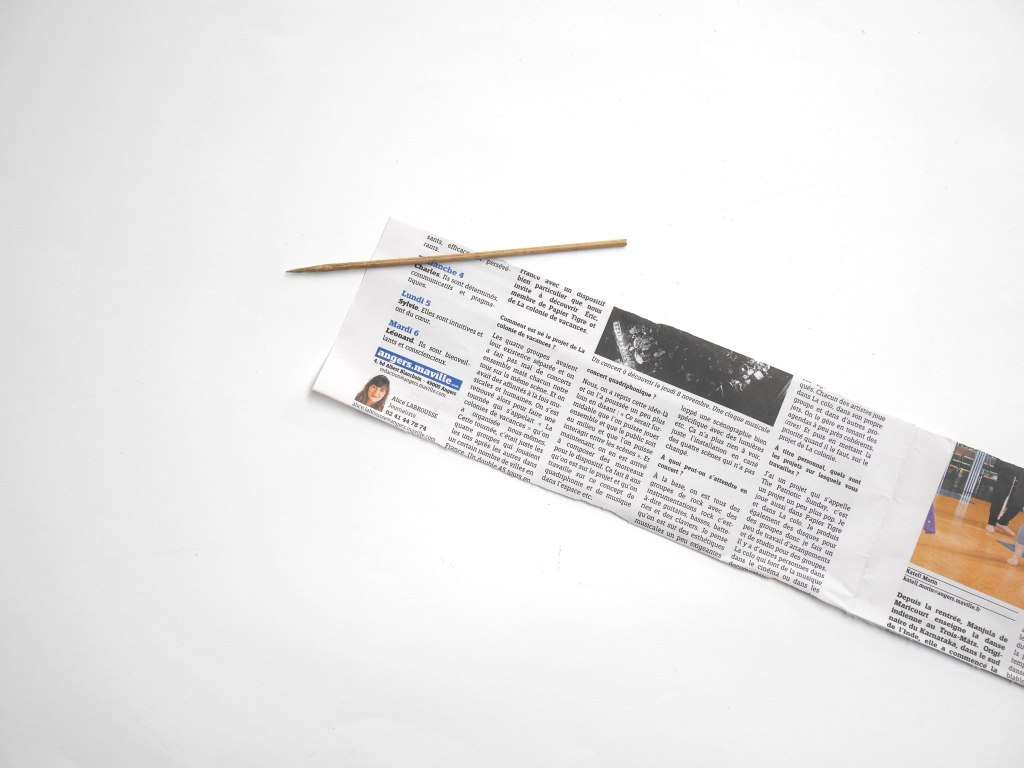 - Enroulez le stick avec le journal afin d’obtenir un grande « paille » de 45 cm environ.