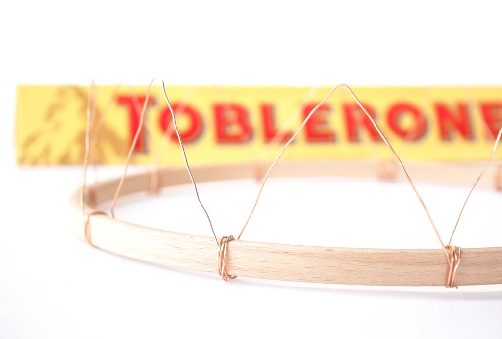 2. Afin de réaliser les « piques » de la couronne, placez la barre de Toblerone sur le cercle et passez le fil de fer par dessous. Enfin, faites-le passer autour du cercle réalisant ainsi quelques boucles afin de fixer le « pique ». Retirez la barre chocolatée délicatement puis renouvelez cette étape.