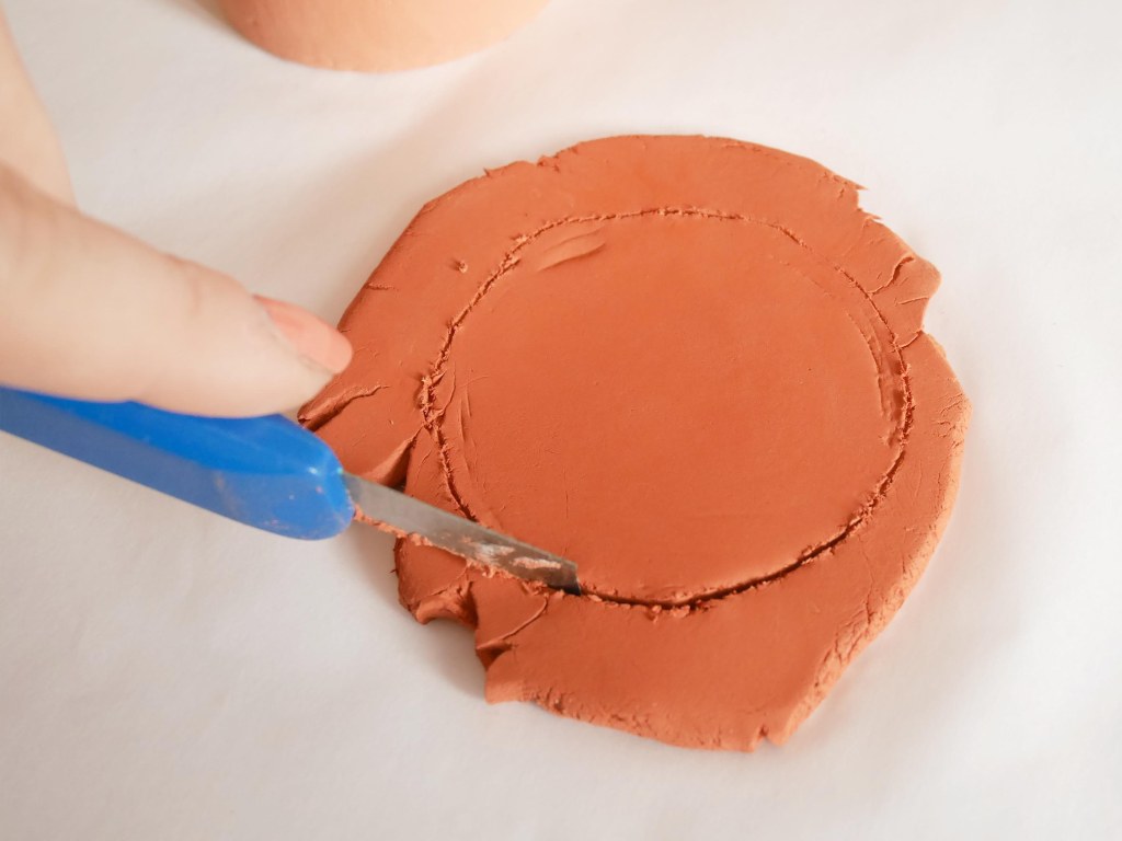 2. Etalez à nouveau l’argile sur 0.5 cm d’épaisseur et coupez la base circulaire, dont la circonférence et la même que le corps du pot. Ici, ma base fait environ 6 cm.
