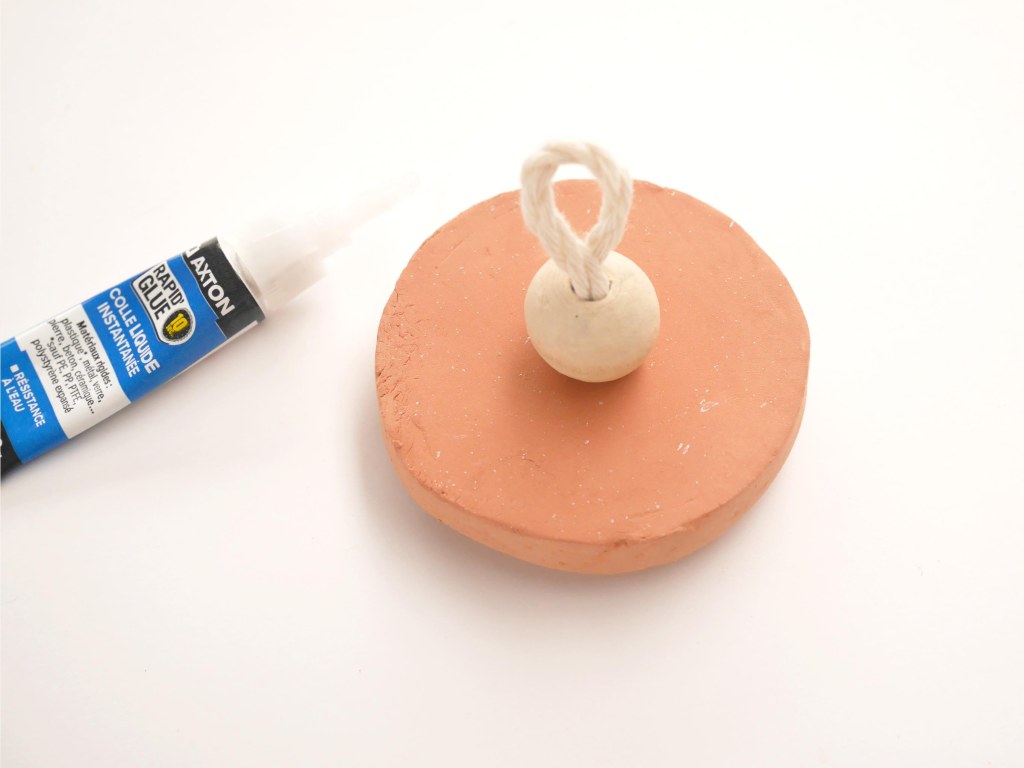 6. Sur le chapeau, collez la perle en bois, dans laquelle vous aurez préalablement fait passer un morceau de cordelette.