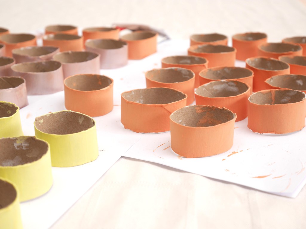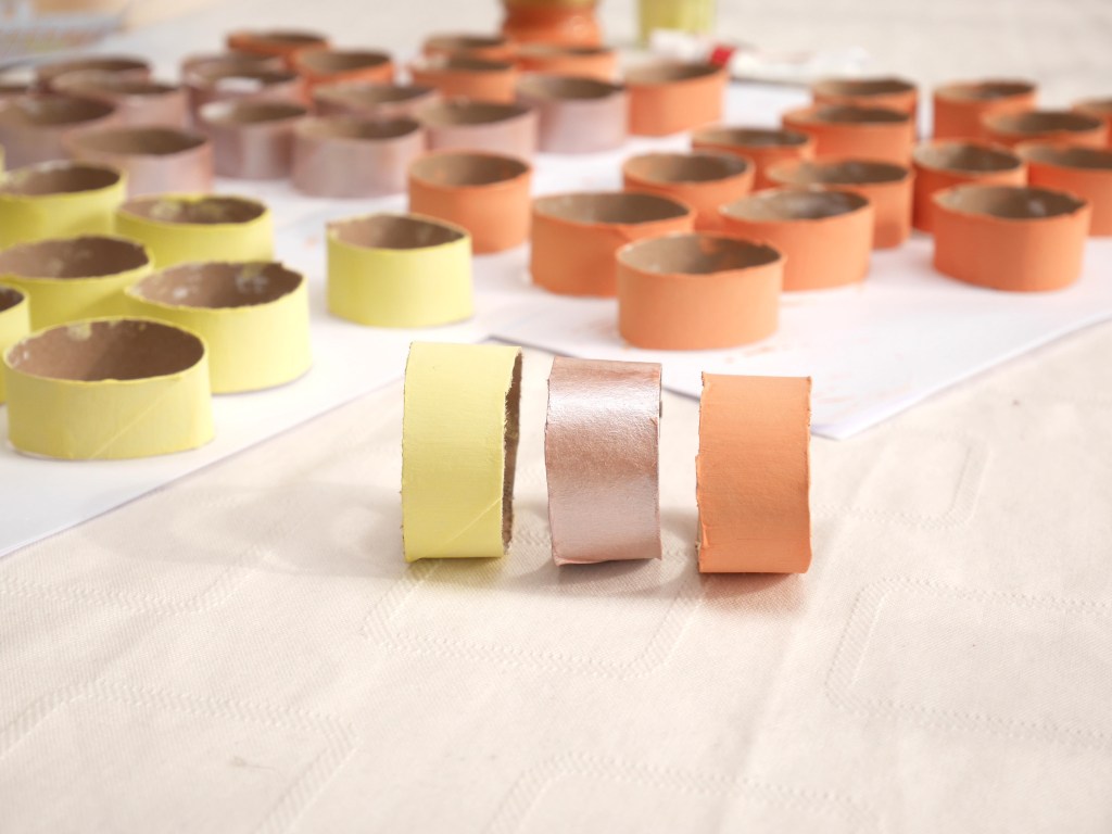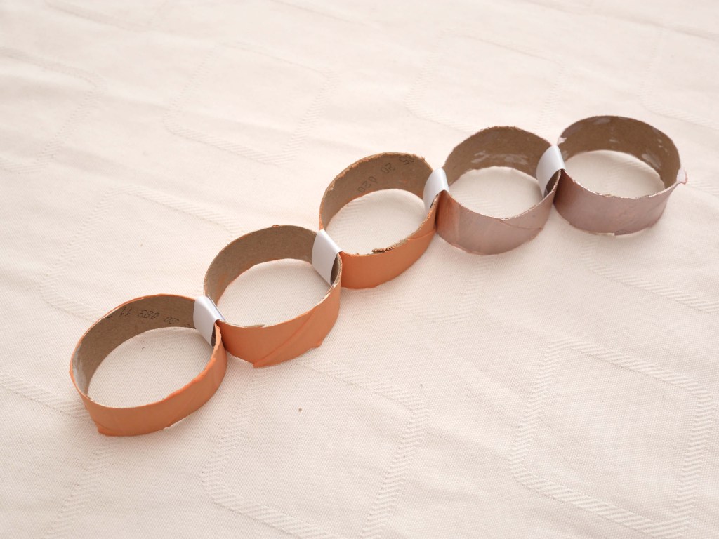 1.Découpez des tronçons dans le rouleau de papier toilette afin d’obtenir des anneaux. (1 rouleau = 5 anneaux) Faites ainsi jusqu’à avoir 55 anneaux.