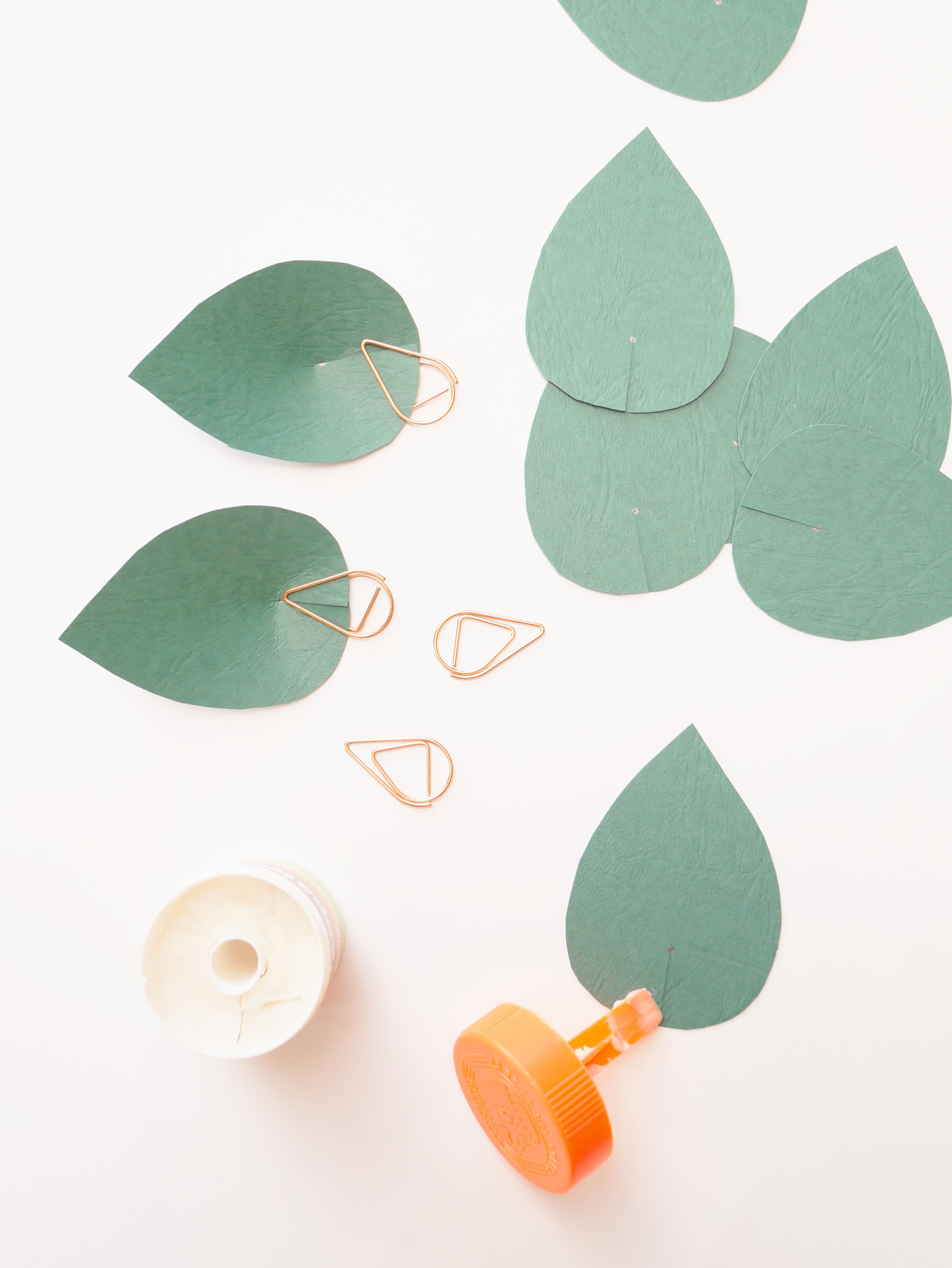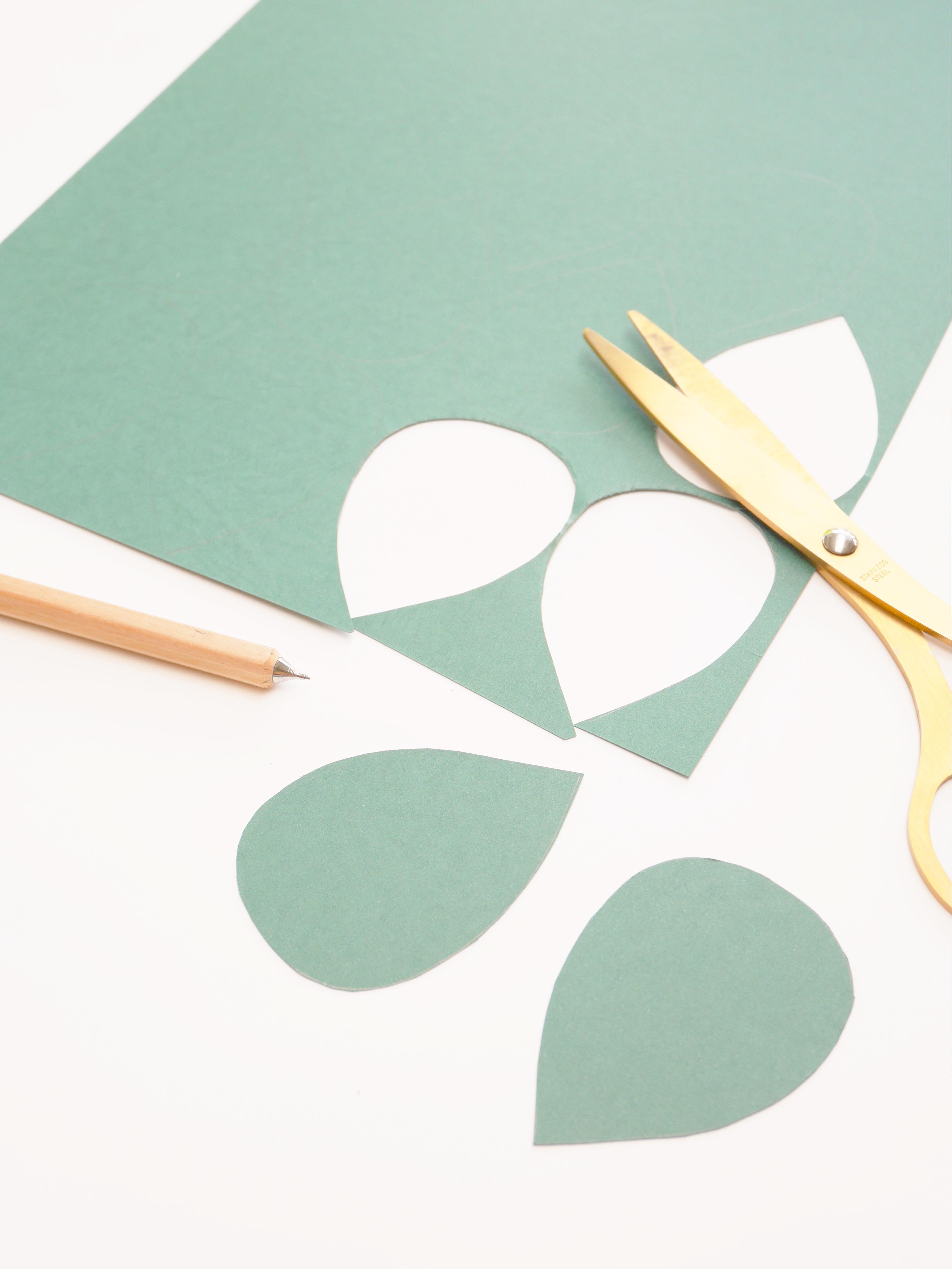 1. Sur la feuille de papier vert, dessinez des formes de feuilles puis découpez-les afin d’en obtenir 10.