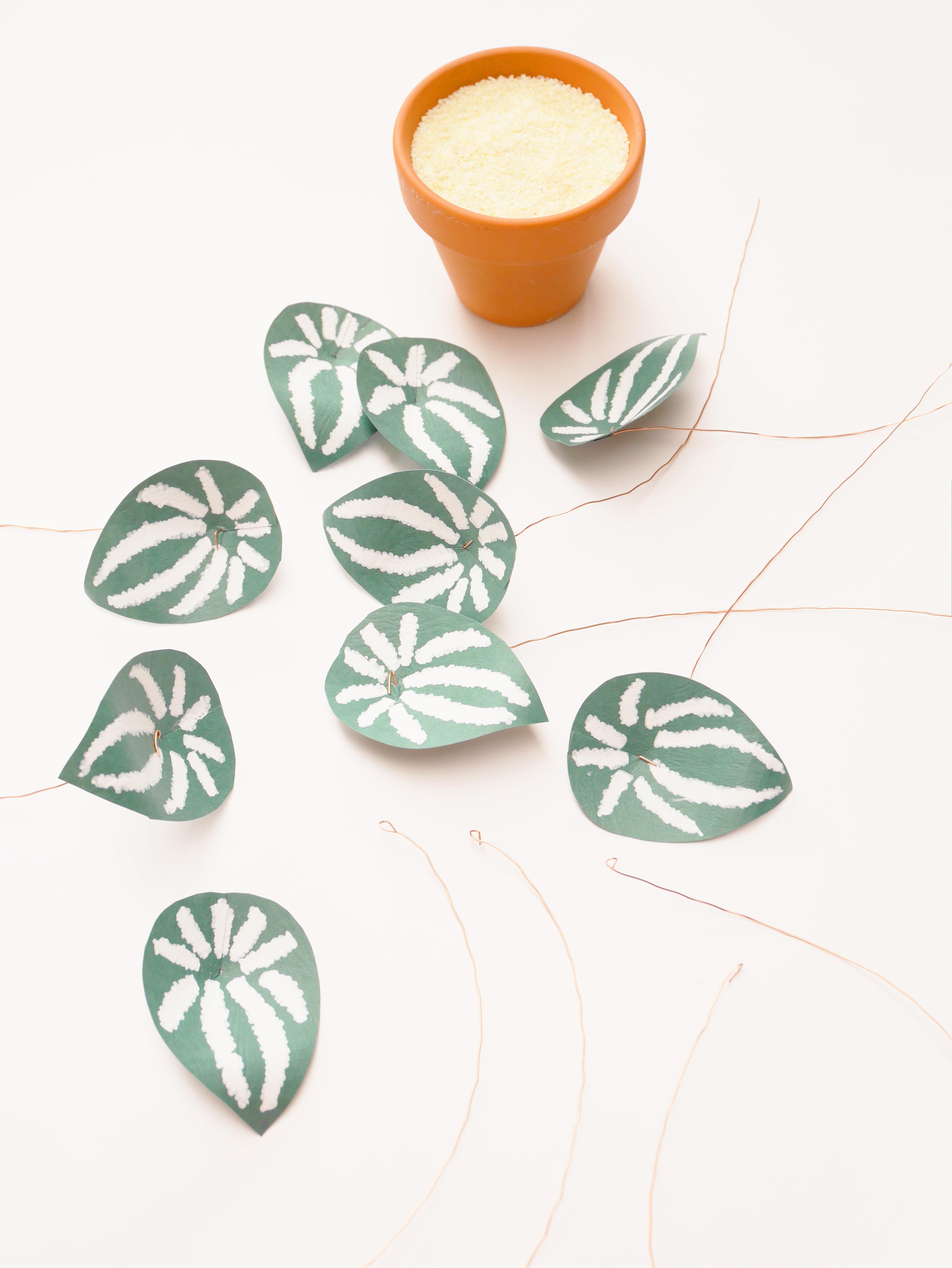 5. Piquez ensuite chaque fil de fer au centre de chacune des feuilles puis placez chaque feuille sur la boucle afin qu’elle ne bouge plus.