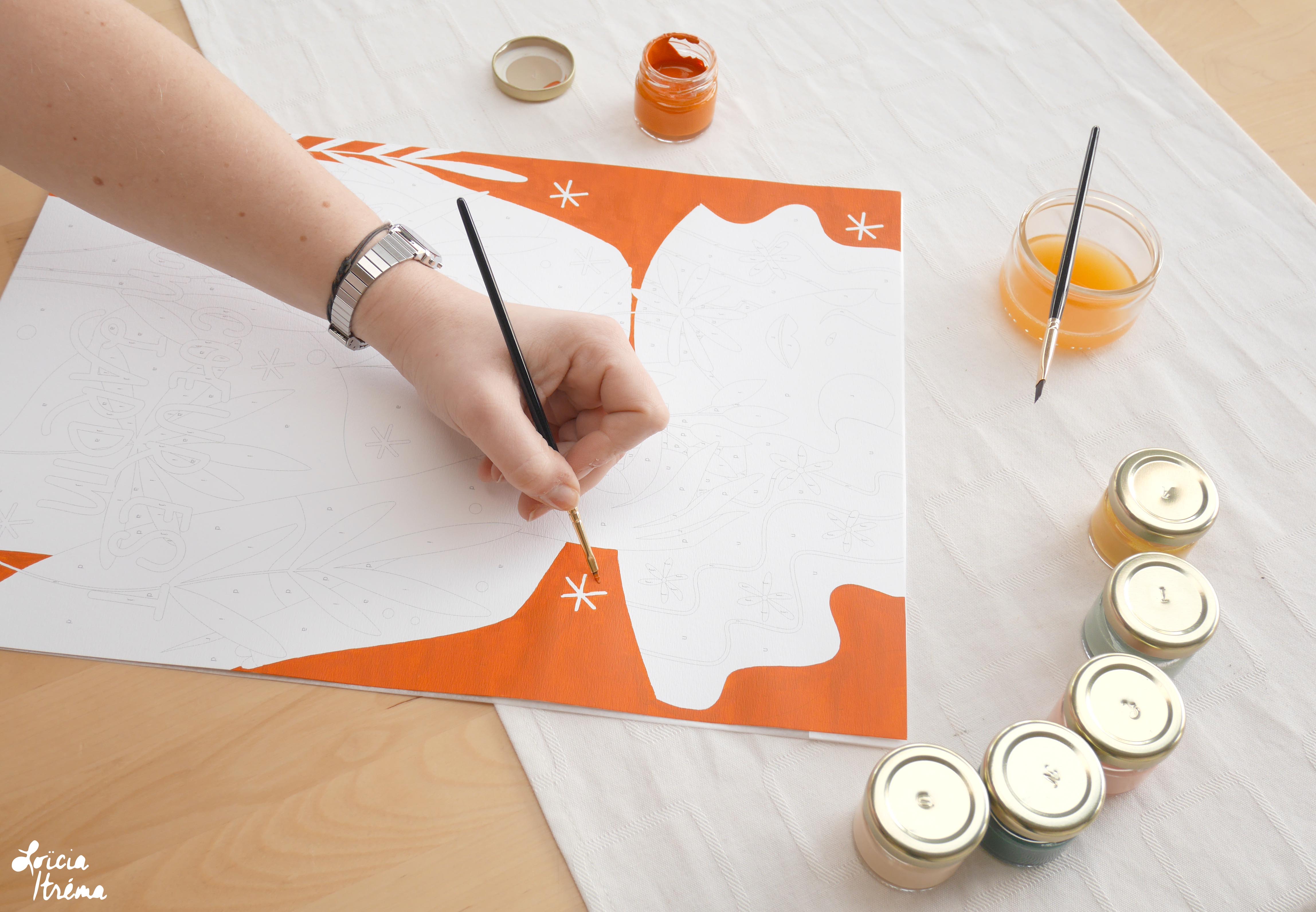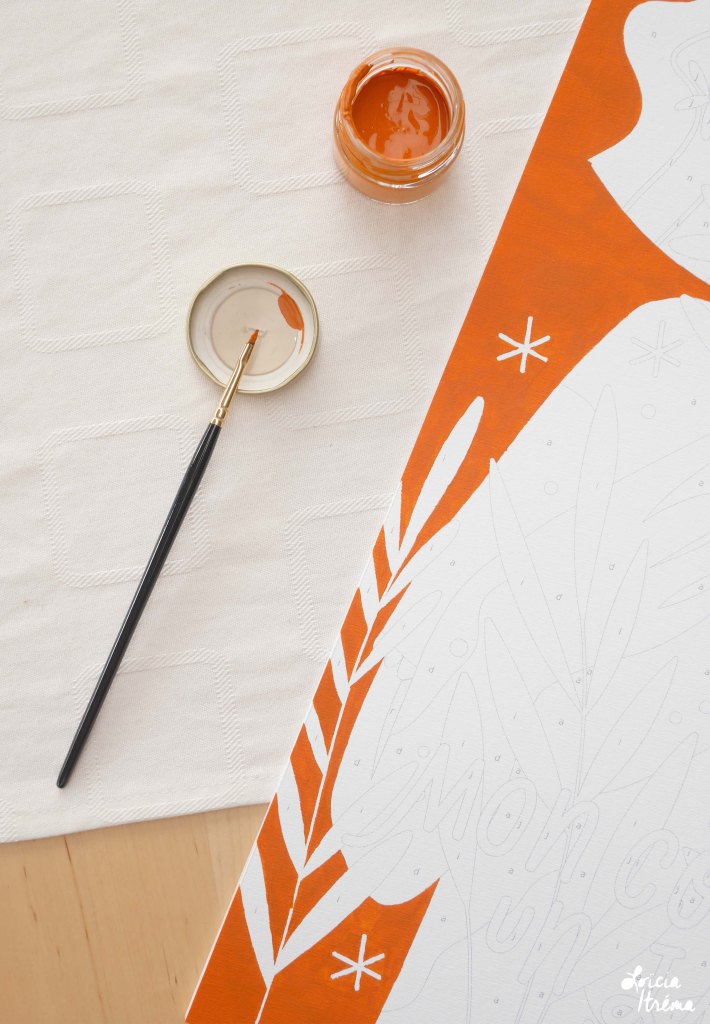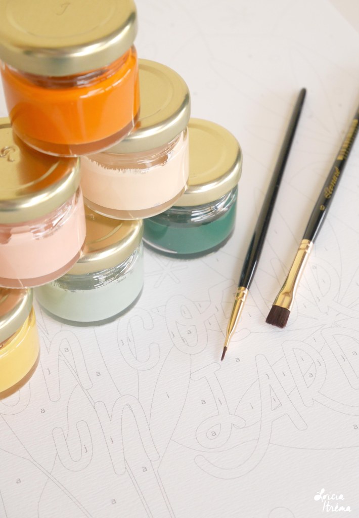 Je n’ai pas encore terminé la peinture. Je me laisse le temps et fais des petites sessions peinture de temps en temps, histoire de faire une pause créative, durant laquelle je rentre dans une bulle, déconnectée de tout ! Quel plaisir ! Souvent, j’en profite pour me poser et écouter un podcast tout en remplissant de peinture les petites cases du tableau. Vous pouvez d’ailleurs suivre mon avancée, que je partage sur Instagram !