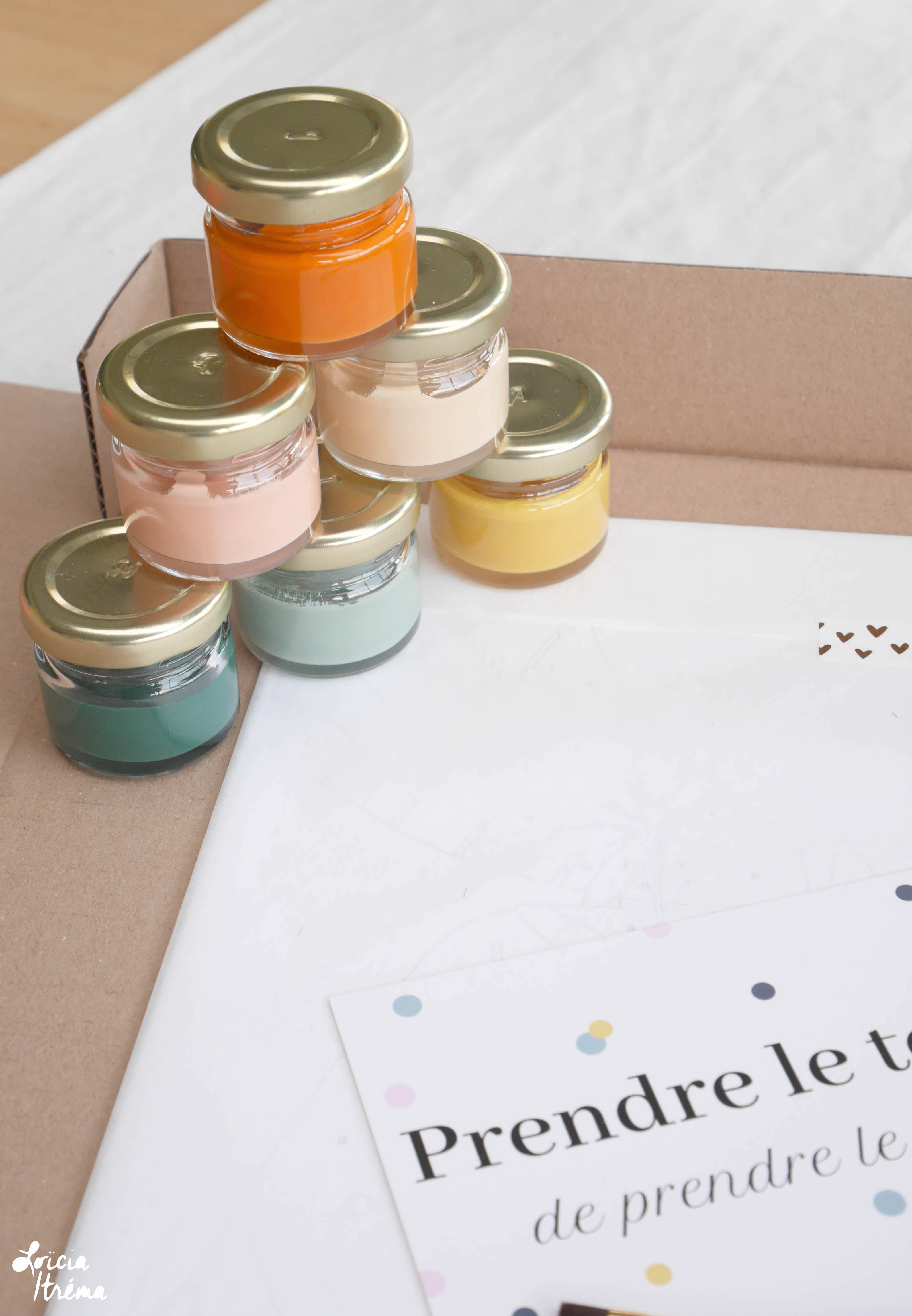 Je vous partage ici quelques photos à réception du kit. tout y est très bien présenté et emballé. Les petits pots de peinture sont tellement cute! Maëlle, la créatrice, vous donne d’ailleurs des astuces sur son compte Instagram pour recycler et réutiliser les pots et la boîte carton du kit. #upcycling