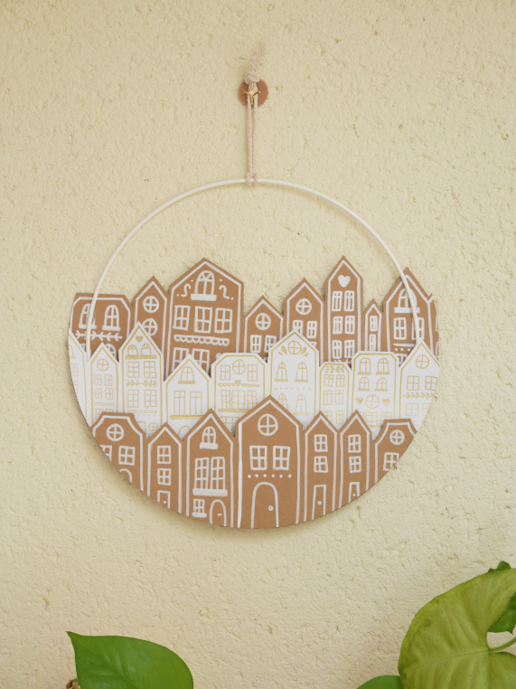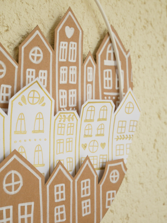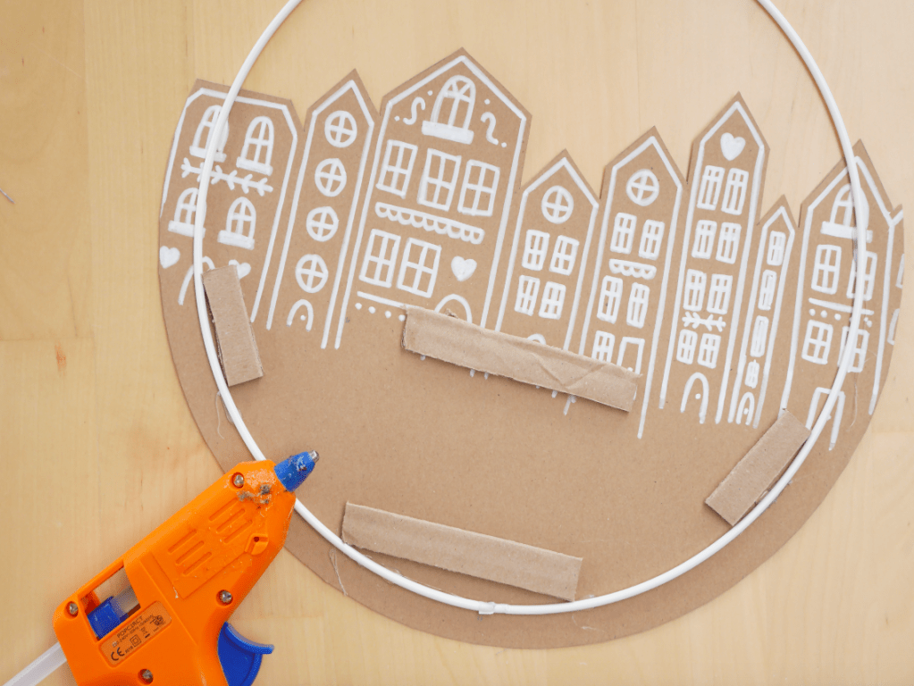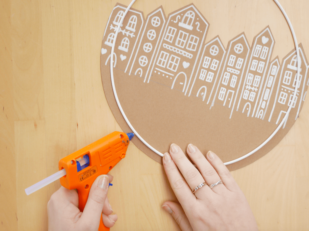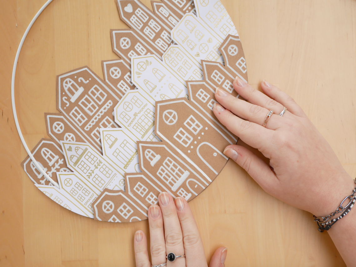 4. Placez le cercle en métal sur le premier niveau (maisons marron) et fixez-les ensemble avec quelques pointes de colle. Je vous conseille d’utiliser le pistolet à colle, si vous en avez un, car le séchage est plus rapide.