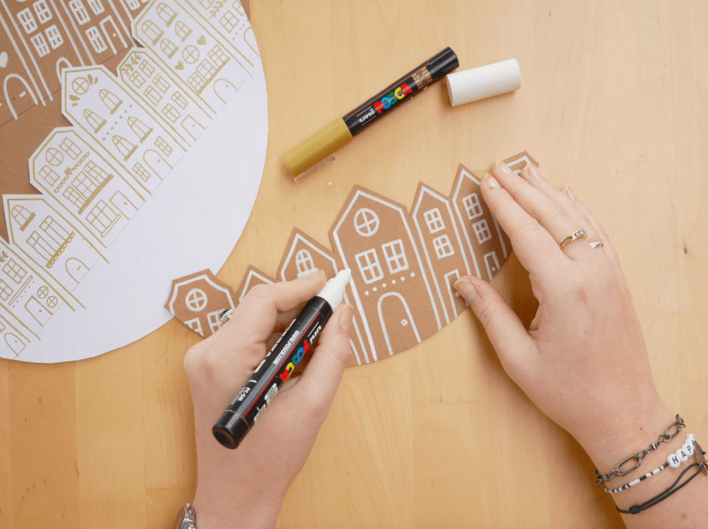 Ici, j’ai utilisé un feutre blanc sur le papier cartonné marron, et un feutre doré pour la feuille blanche.