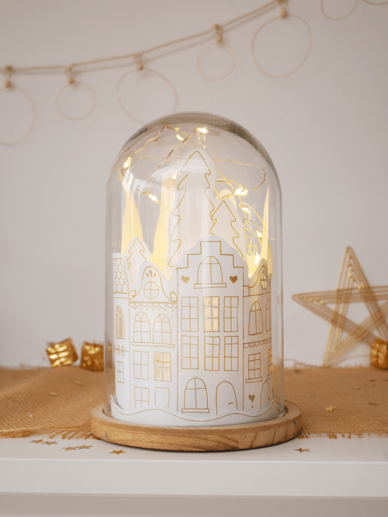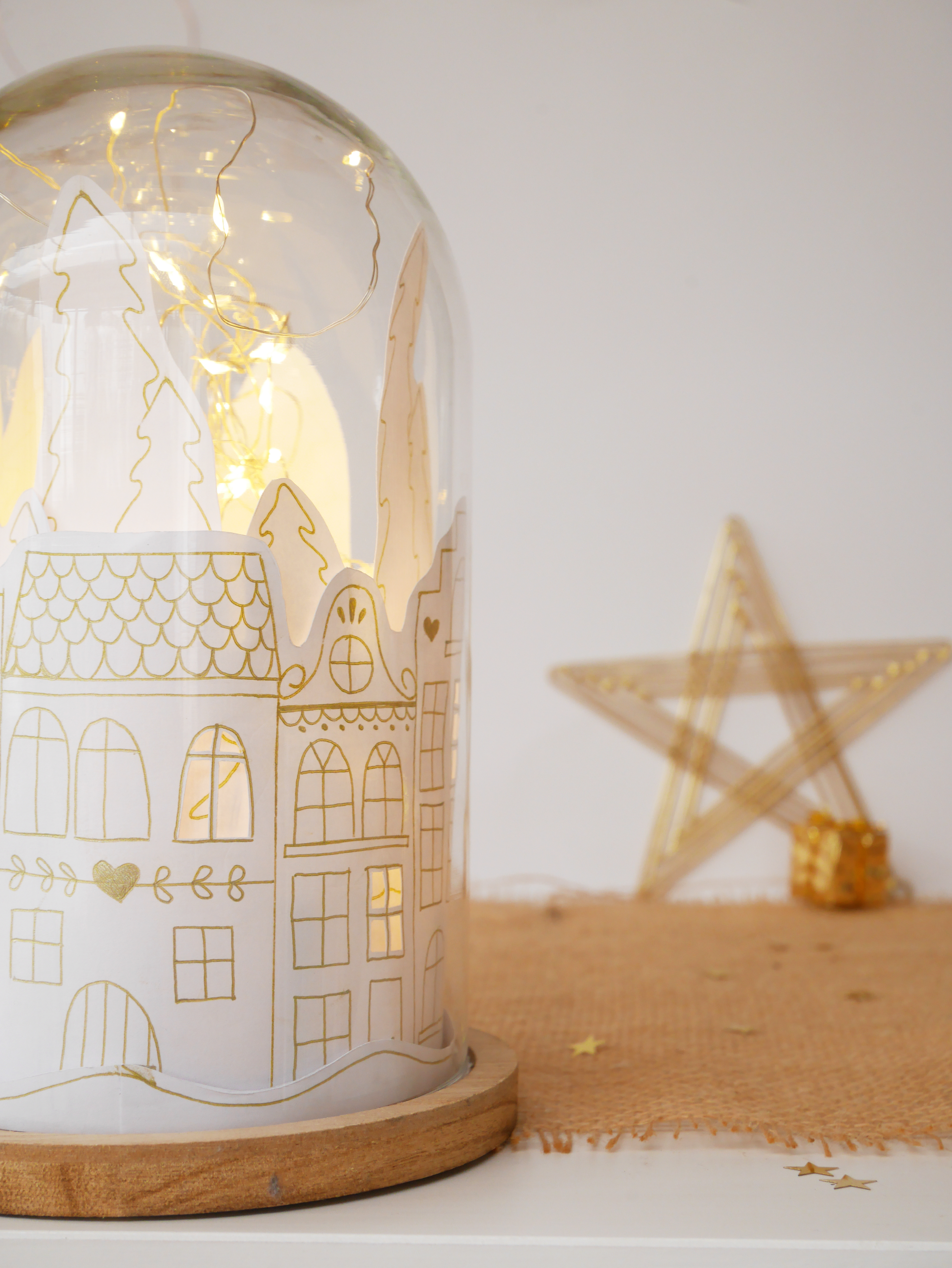 7. Placez l’ensemble dans votre cloche et mettez la guirlande lumineuse au milieu du village.