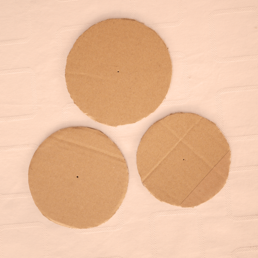 1. Débutez en découpant 3 cercles dans le carton : un de 10.5 cm de diamètre, l’autre de 11 cm et le dernier de 11.5 cm. Ils vous serviront ensuite de socles pour votre décor.