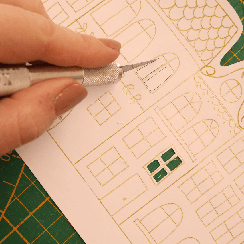3. À l’aide d’un cutter, coupez les contours et les détails de la forêt et du village.