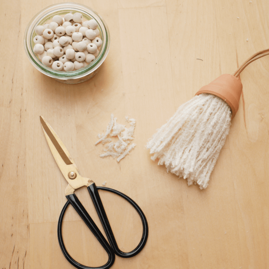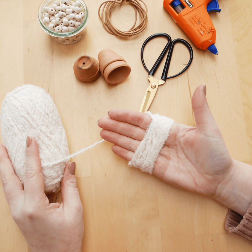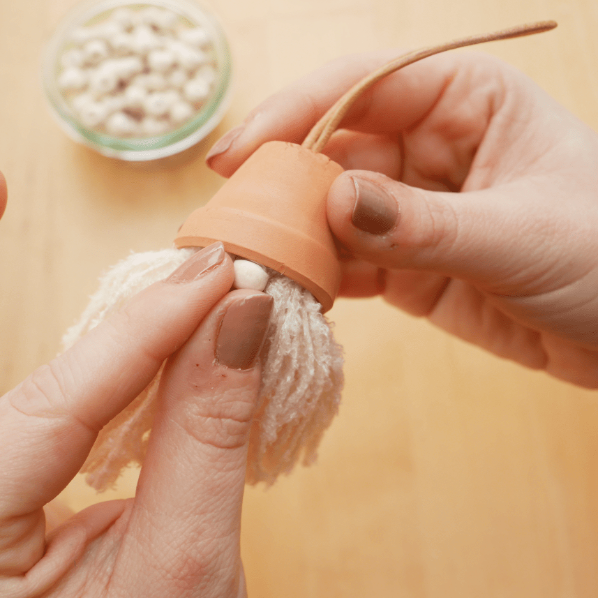 3. Ajoutez une petite perle en bois au centre, à la limite du mini pot et de la laine. Laissez bien sécher.