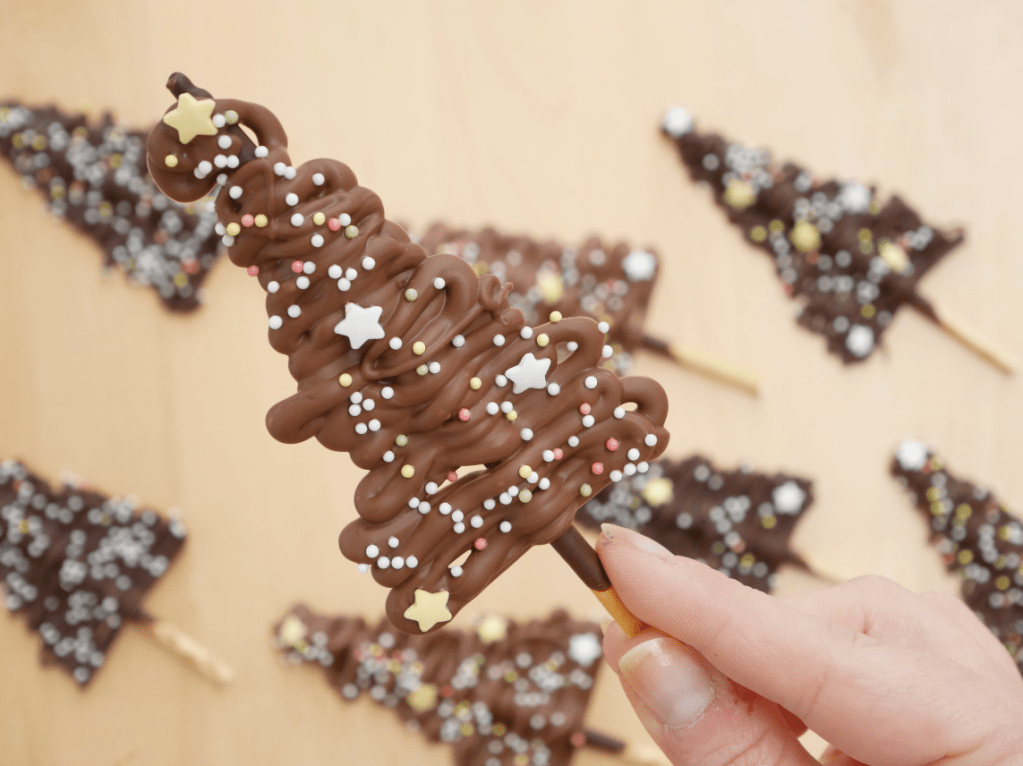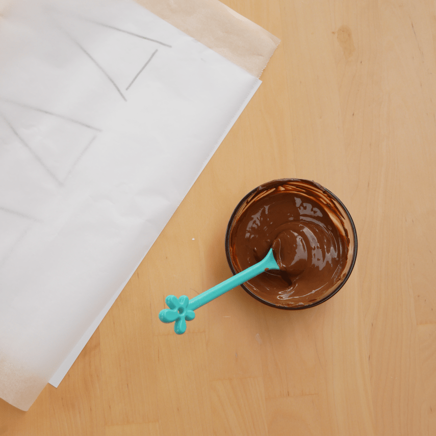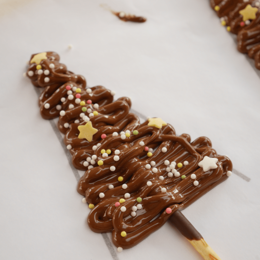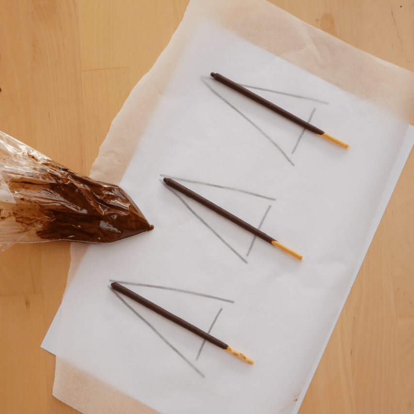 6. Faites couler délicatement le chocolat de part et d’autre de chaque bâton afin de créer la forme d’un sapin, en faisant des va et vient, de gauche à droite.
