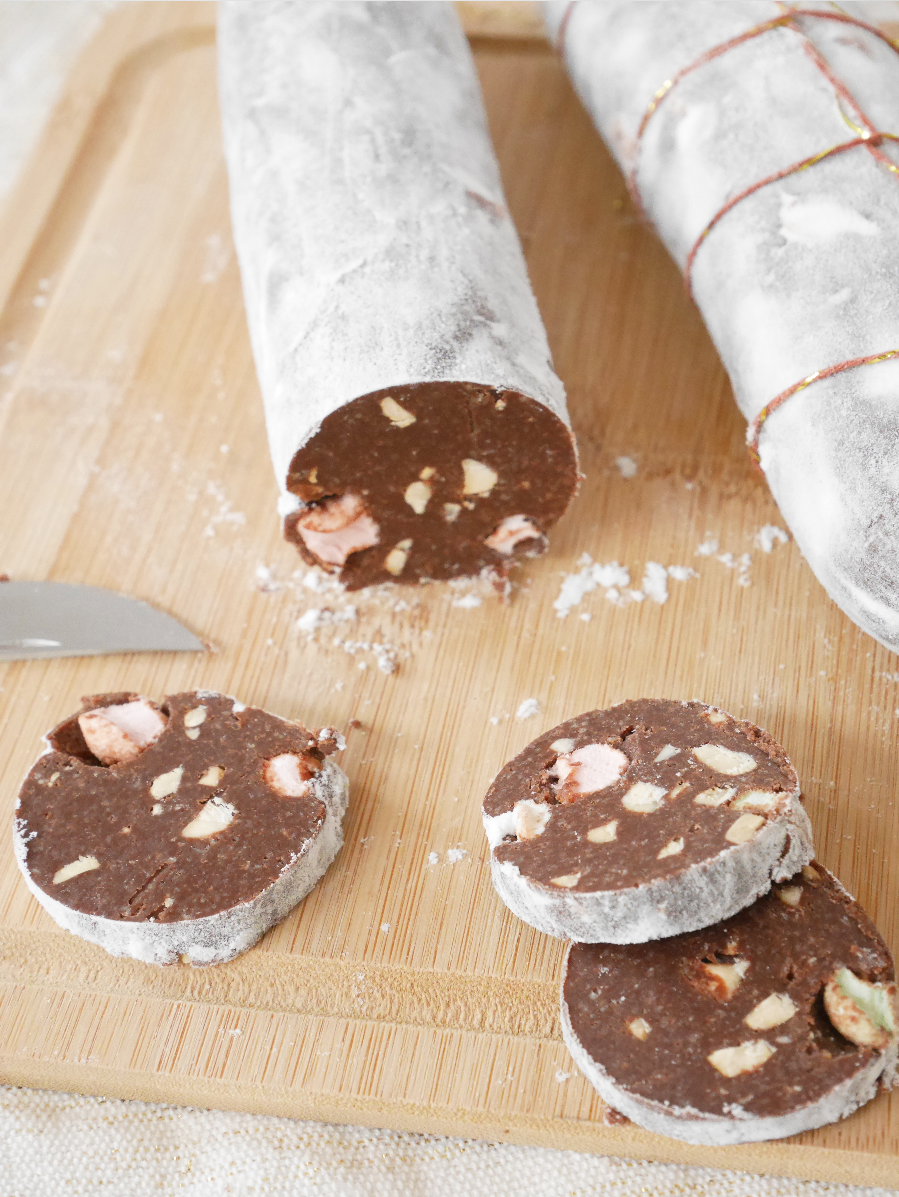 Option : vous pouvez également enrouler votre saucisson au chocolat dans du papier sulfurisé pour un effet encore plus “artisanal”.