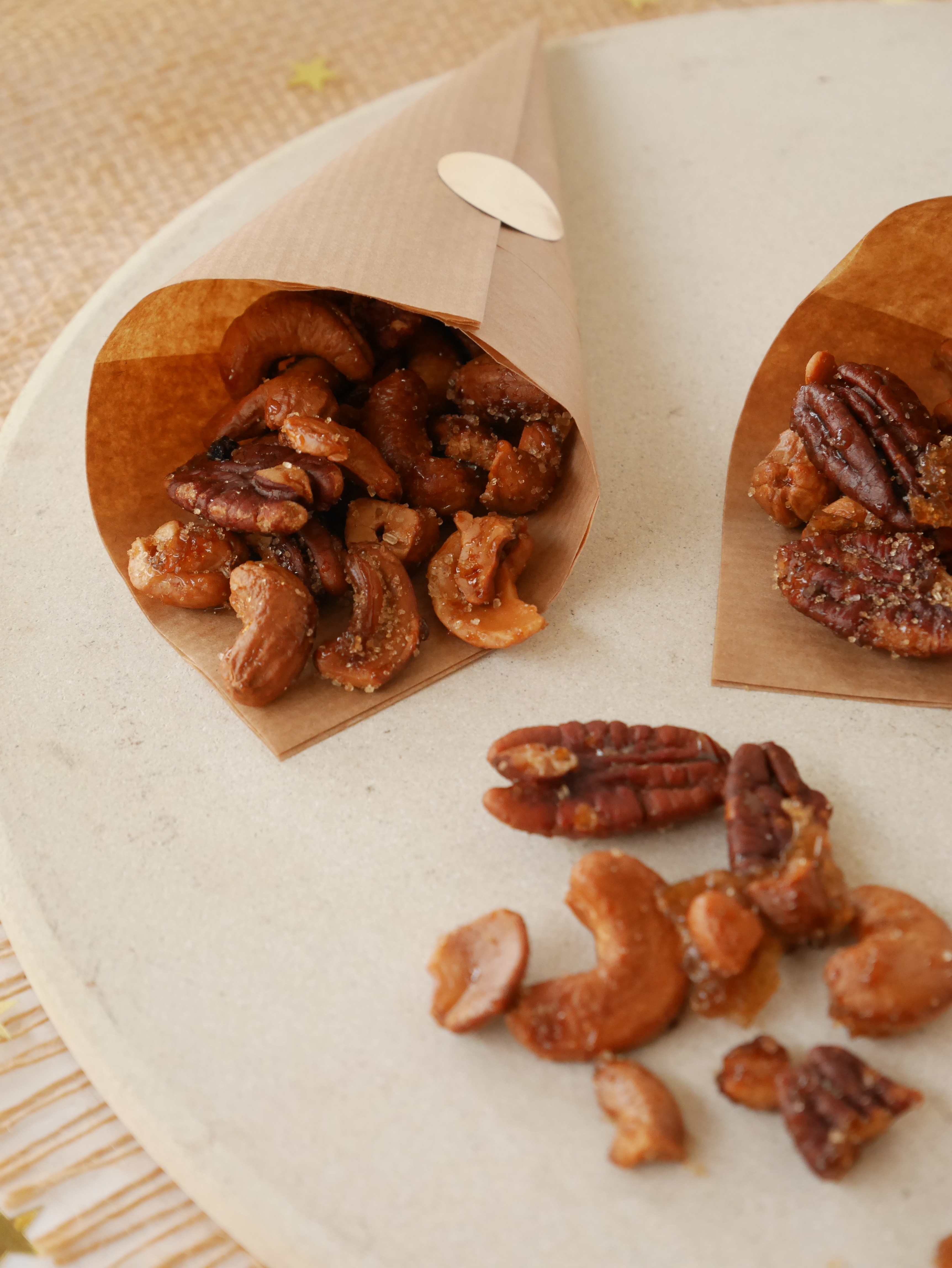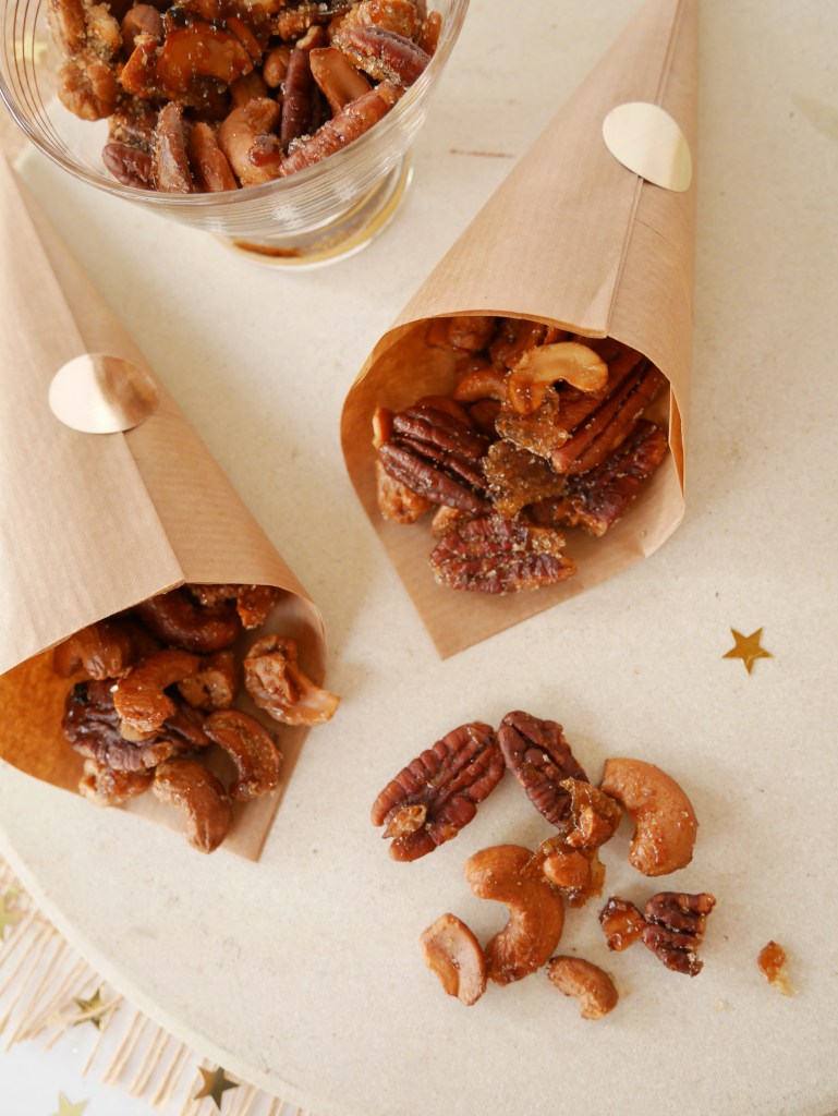 Yummy! Dernière ligne droite avant le passage du Père Noël ! Pour patienter, devant un bon téléfilm de Noël, voici une nouvelle recette de snack tout en simplicité. Pour changer un peu des recettes au chocolat, j’opte cette fois pour des noix avec une touche d’esprit de Noël. Pour l’occasion, je me suis même amusée à réaliser des petits cornets avec des chutes de papier !