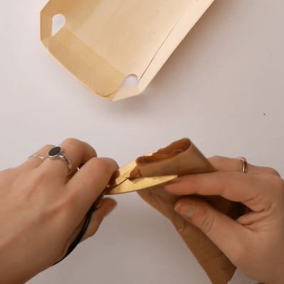 9. Découpez les bandelettes dans un sachet en papier et réaliser les « confettis » pour remplir la barquette.