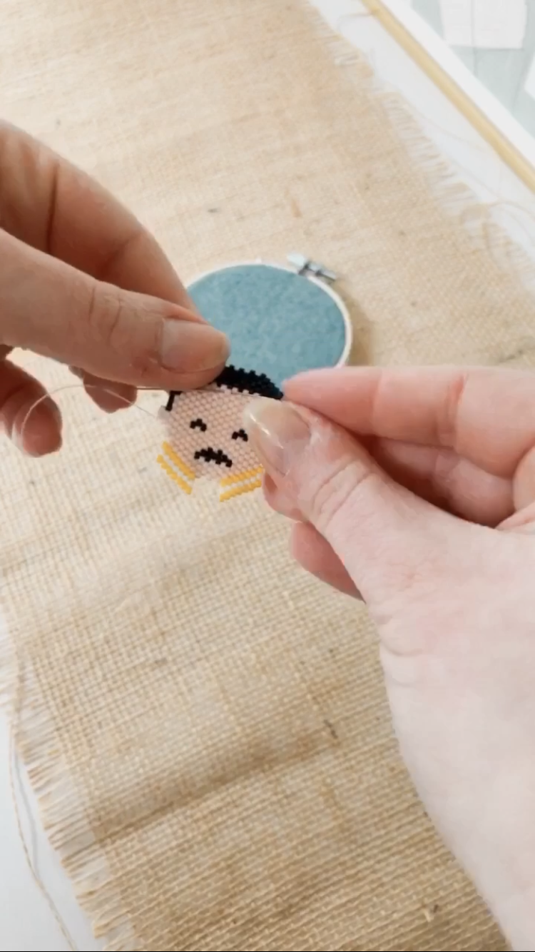 3. Fixez ensuite le tissage en perle miyuki à l’aide du fil et une aiguille. Faites ainsi passez le fil dans un des perles du haut et cousez la au tissu.