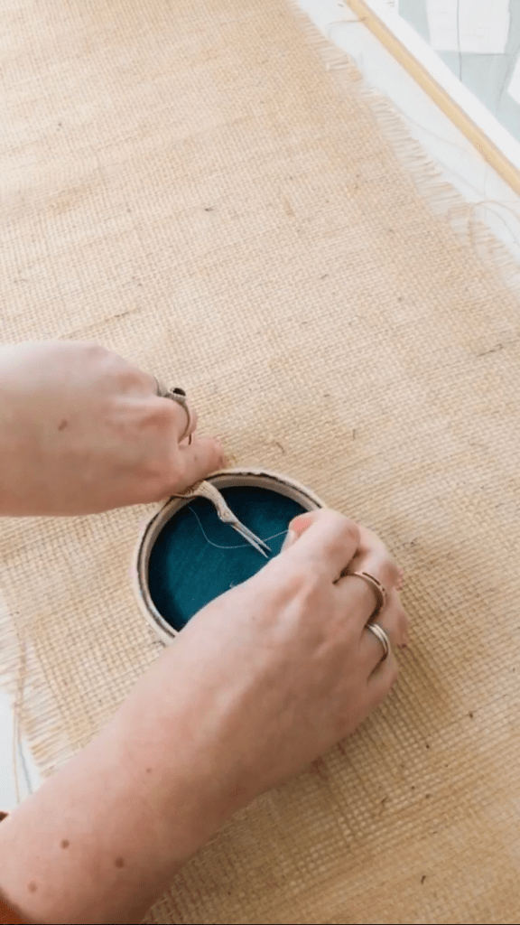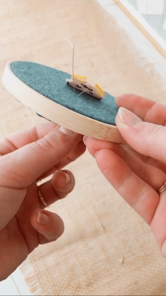 Et pour parfaire ma réalisation, j’ai décidé de créer un vrai objet déco à partir de ce tissage. L’astuce est simple, il suffit de coudre la création sur une chute de tissu et d’utiliser un tambour à broder en guise de cadre. Tada!