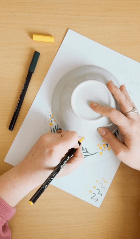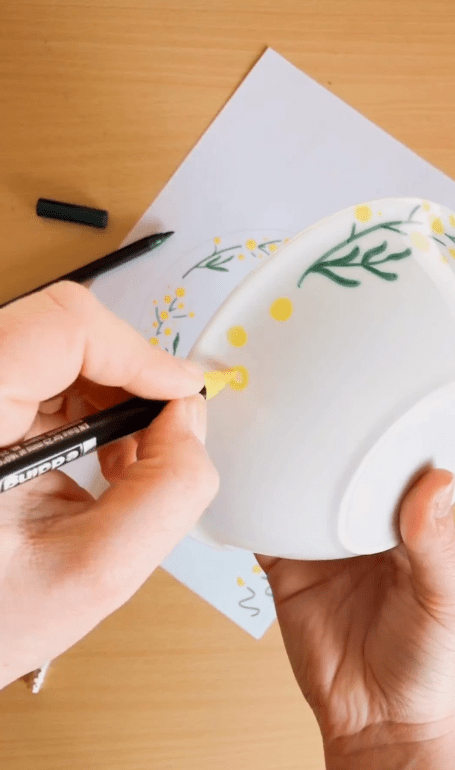 2. Dessinez ensuite le motif mimosa sur le contour extérieur du bol, avec les crayons spéciaux vert et jaune.