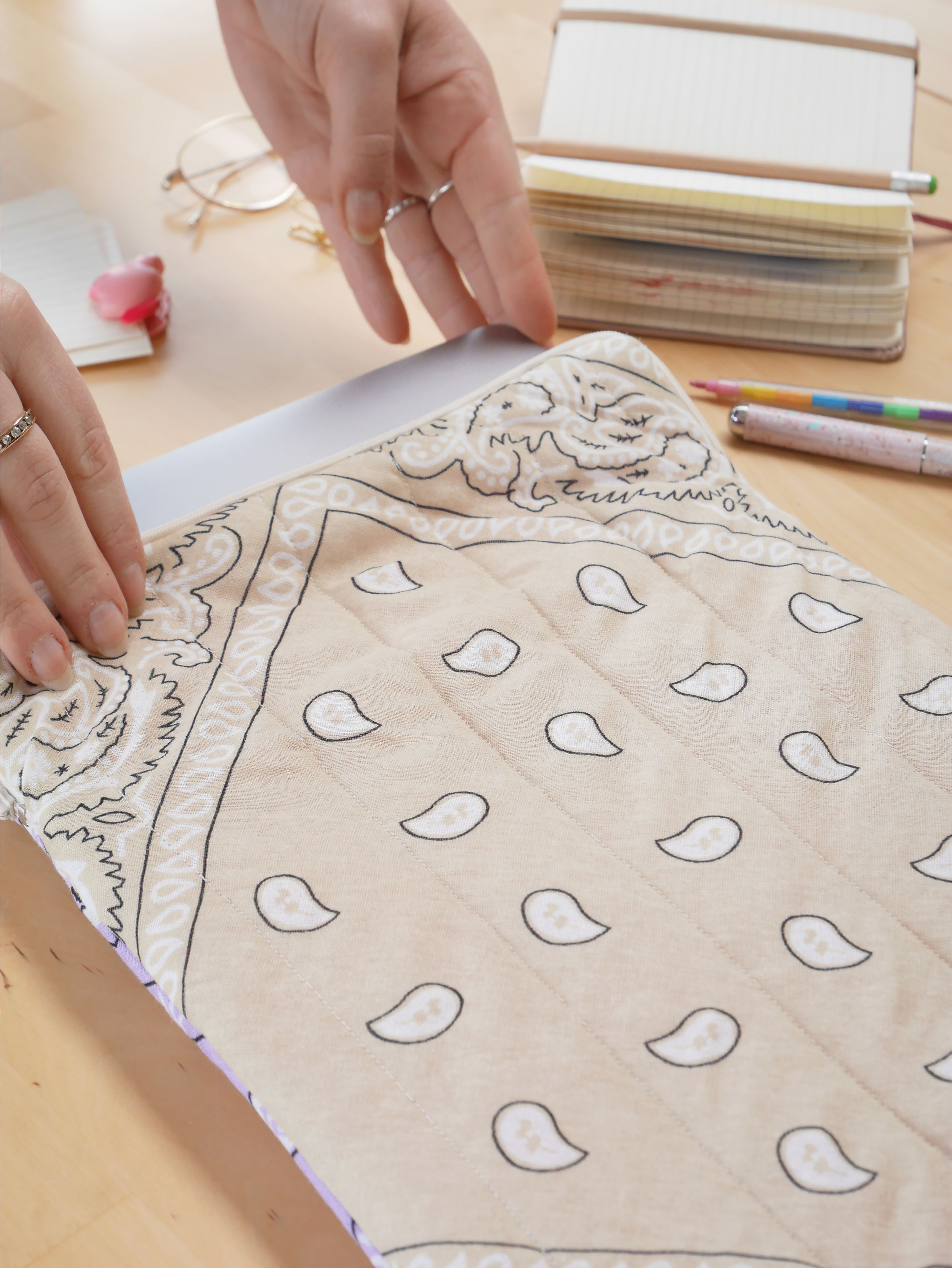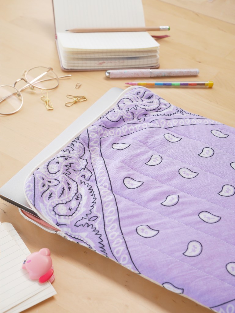 Vrai symbole de la mode des années 90, le bandana est devenu un incontournable dans les vestiaires. Pour ce numéro de « J’aime créer », il a été décliné en pochette d’ordinateur bi-colore. N’est-ce pas cute ?
