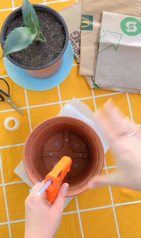 Commençons par préparer notre pot. Si votre pot a des trous au fond pour l’écoulement de l’eau, vous pourrez les boucher pour éviter que le papier kraft ne soit mouillé. Utilisez votre pistolet à colle pour sceller soigneusement les trous.