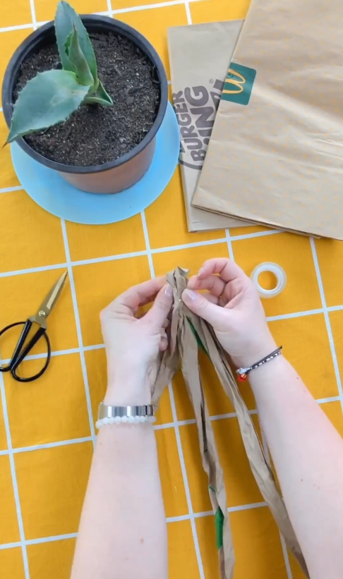 Prenez les sacs en papier kraft et découpez-les pour créer des bandes de papier d’environ 5 cm de largeur. Plusieurs sacs seront nécessaires, en fonction de la taille de votre pot et de la longueur des bandes.