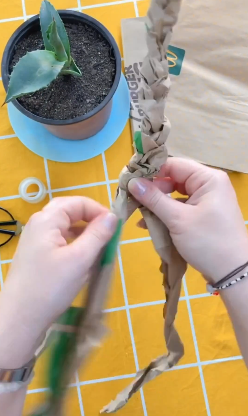 Maintenant que vous avez vos bandes de papier kraft torsadées, il est temps de les assembler en tresses. Prenez trois bandes torsadées et commencez à les entrelacer pour former une tresse. Répétez cette étape jusqu’à ce que vous ayez suffisamment de tresses pour recouvrir votre pot. Pour un pot d’environ 20 cm de hauteur, j’ai utilisé cinq tresses.