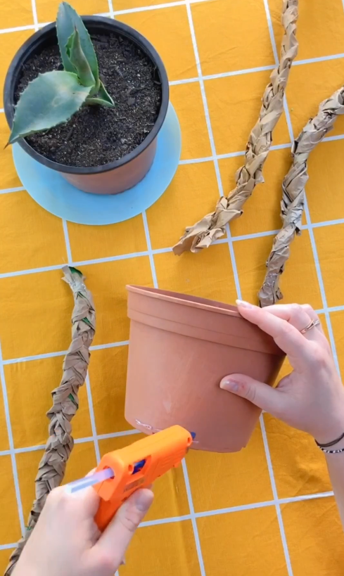 Utilisez votre pistolet à colle pour fixer les tresses autour du pot. Commencez par le bas et travaillez lentement vers le haut. Assurez-vous que les tresses sont bien collées et qu’elles adhèrent parfaitement au pot.