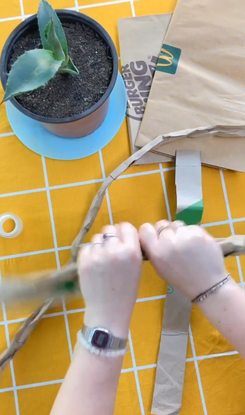 Prenez les sacs en papier kraft et découpez-les pour créer des bandes de papier d’environ 5 cm de largeur. Plusieurs sacs seront nécessaires, en fonction de la taille de votre pot et de la longueur des bandes.