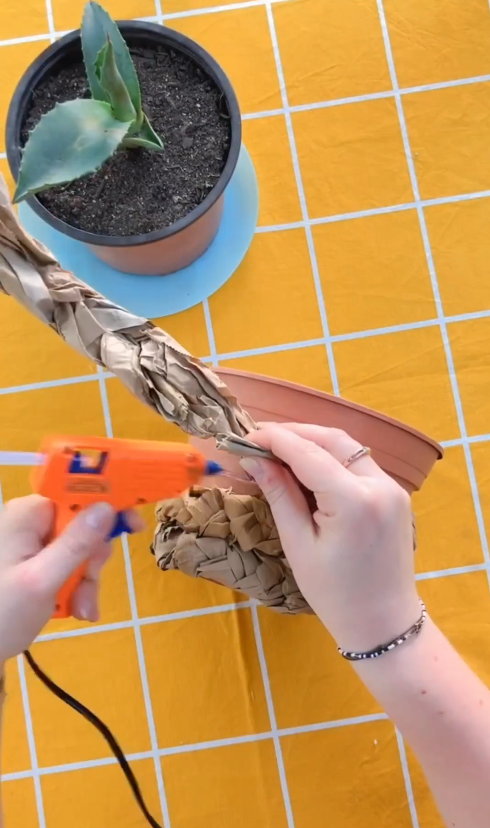 Utilisez votre pistolet à colle pour fixer les tresses autour du pot. Commencez par le bas et travaillez lentement vers le haut. Assurez-vous que les tresses sont bien collées et qu’elles adhèrent parfaitement au pot.