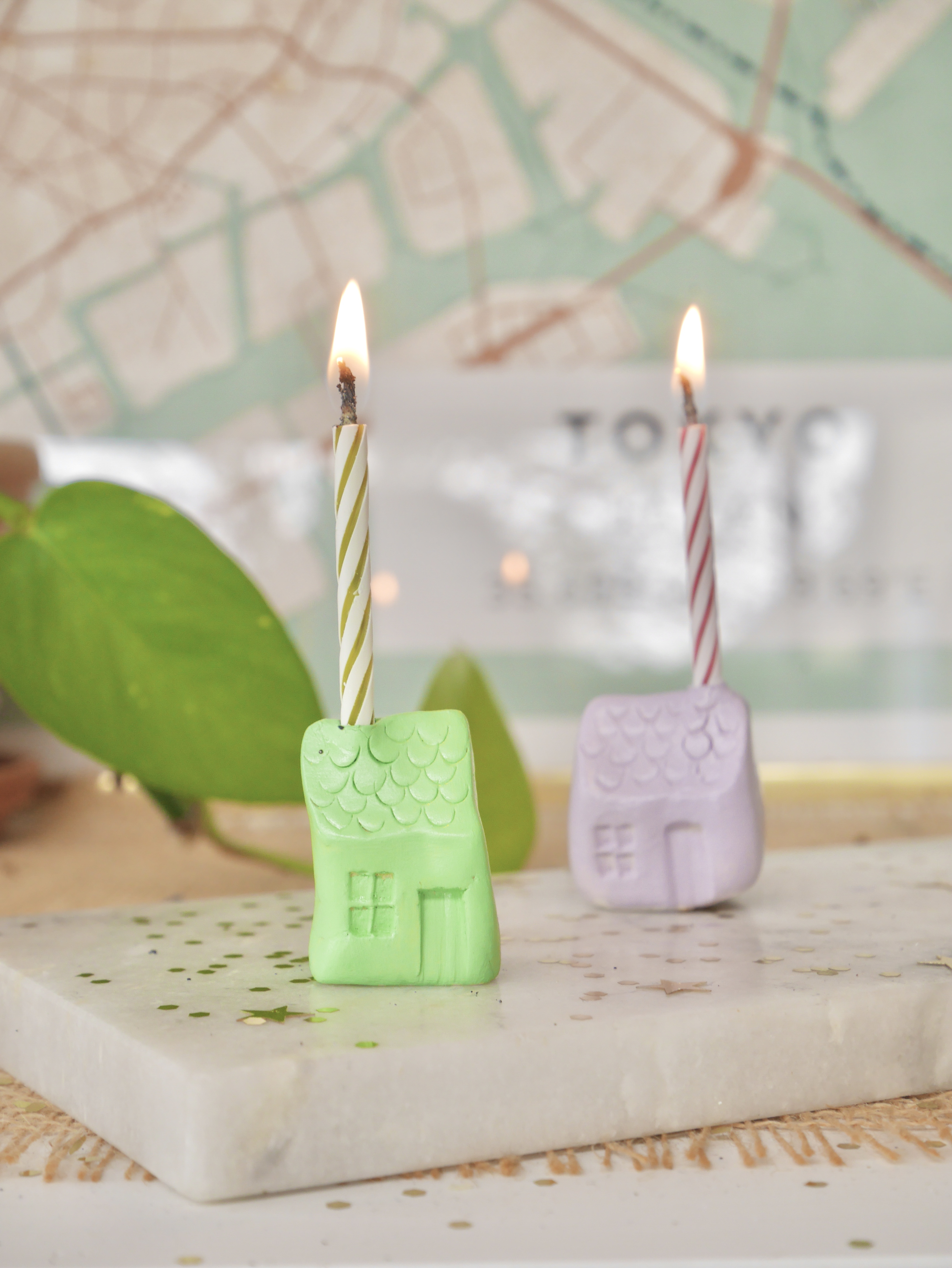 Une fois vos mini-maisons prêtes, il vous suffit d’insérer une bougie d’anniversaire dans le trou du toit de chaque maison !