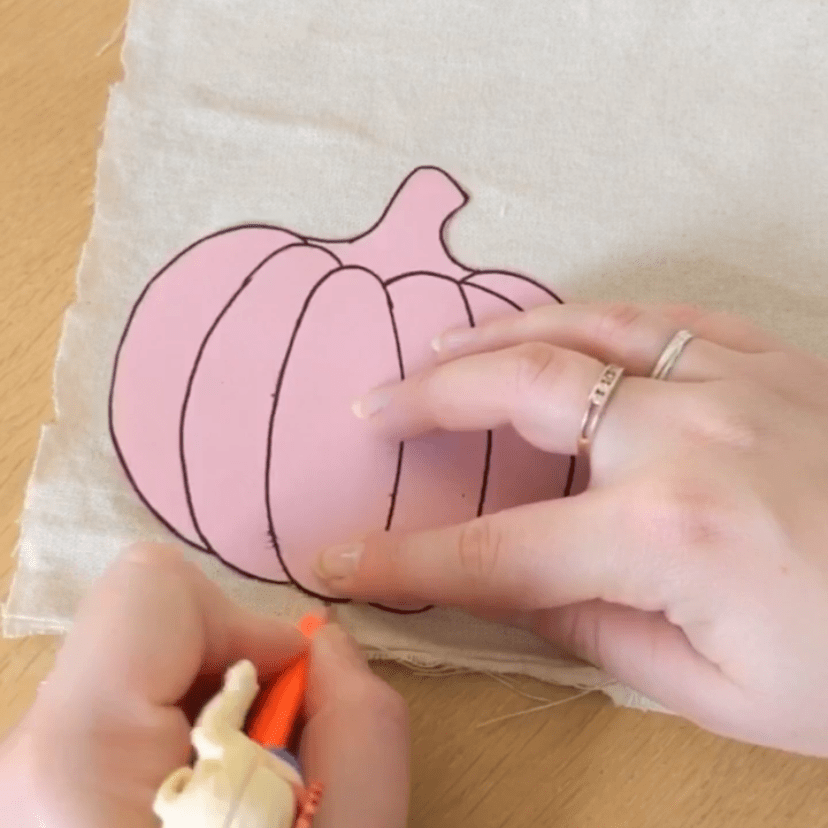 Une fois que vous avez cousu la citrouille, coupez le tissu tout autour de la forme en laissant environ 1 cm de marge. À l’aide d’un découd-vite (ou un outil similaire), effilochez le tissu tout autour de la citrouille pour créer un effet rustique. Si nécessaire, coupez les fils qui dépassent.