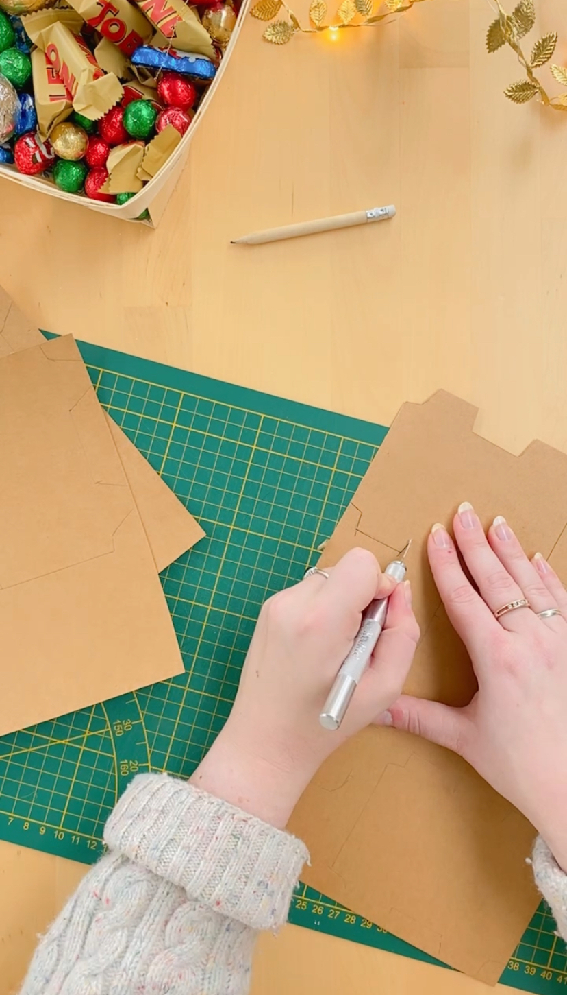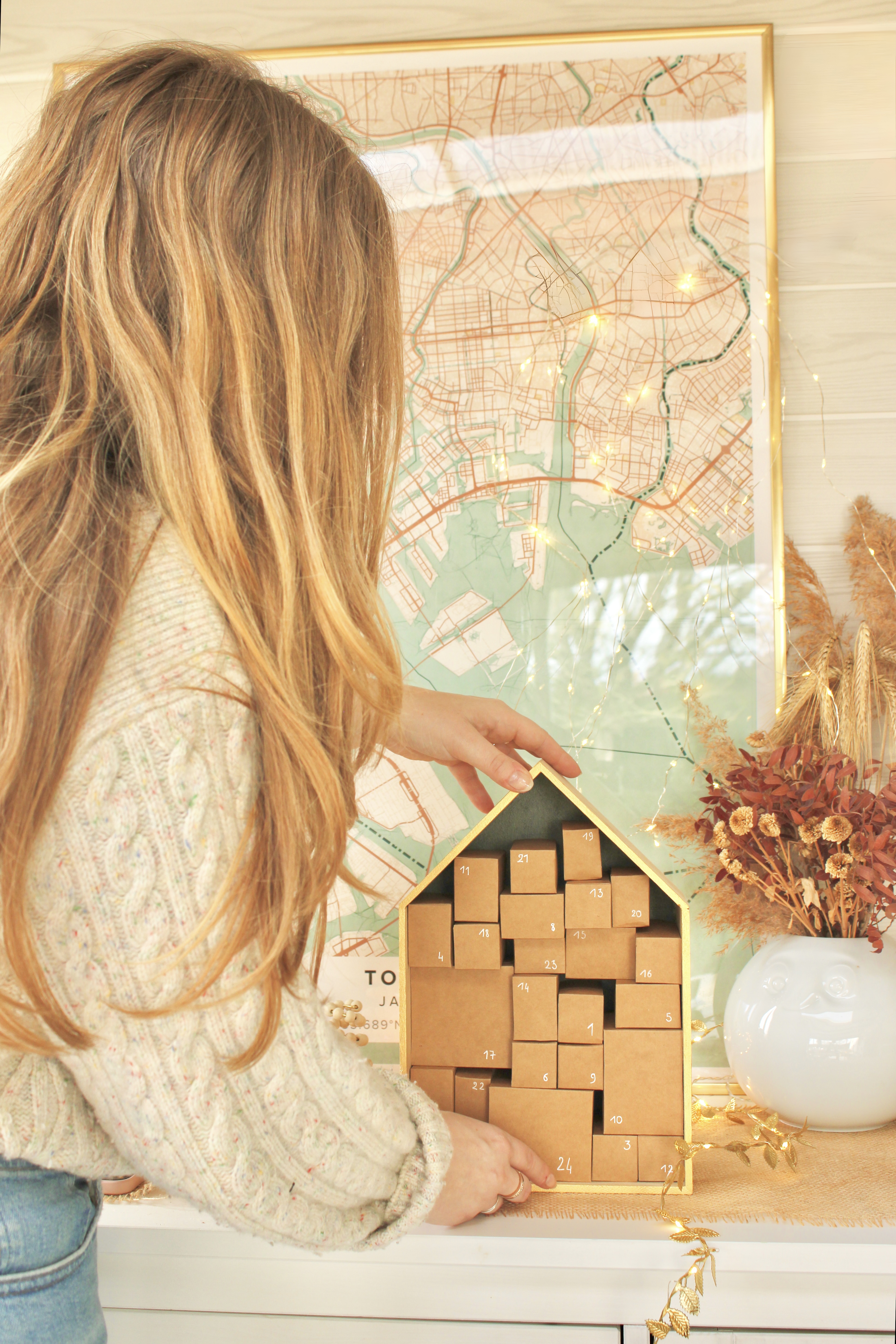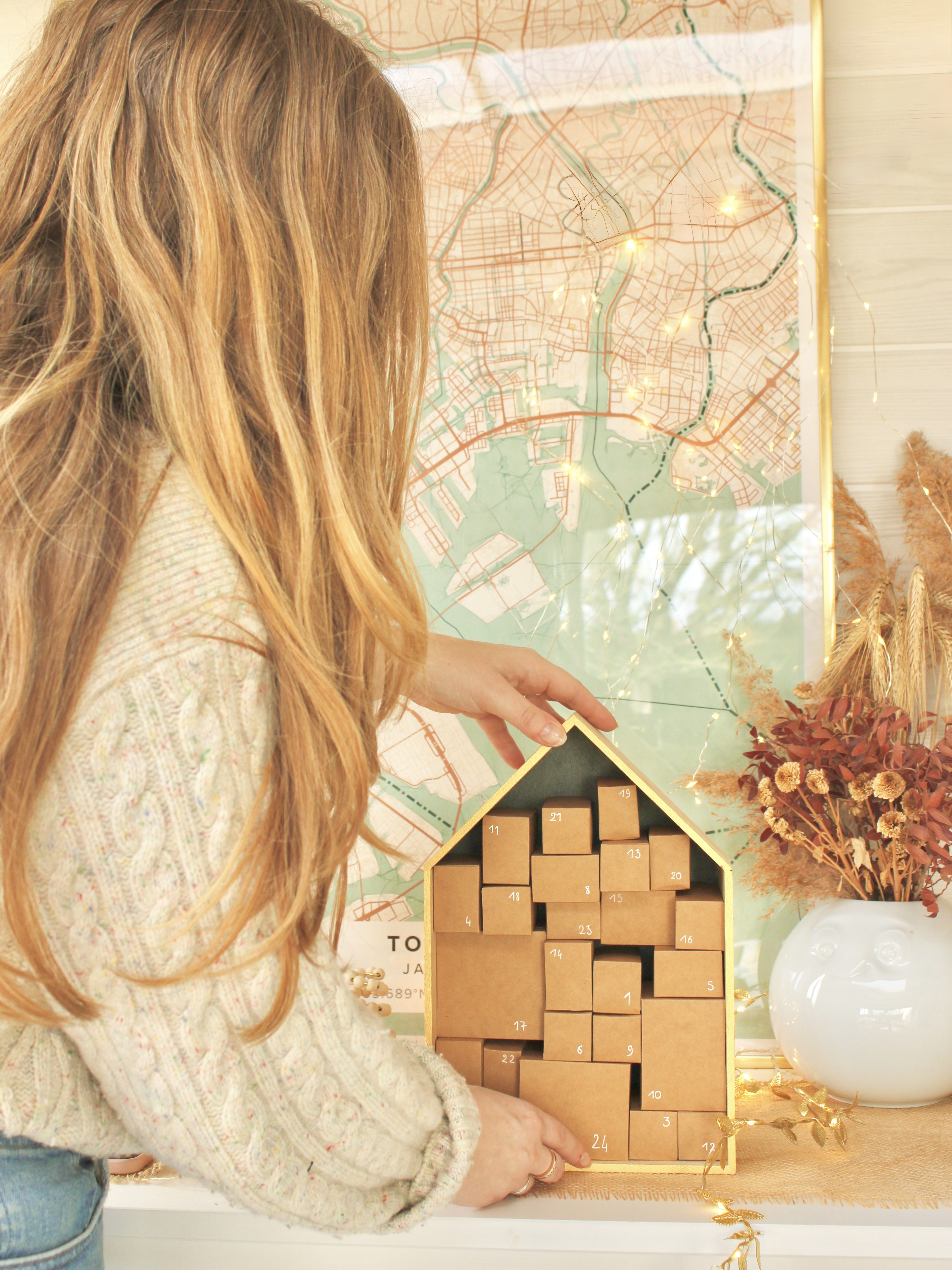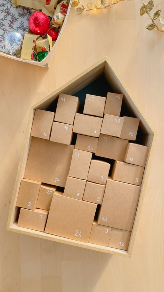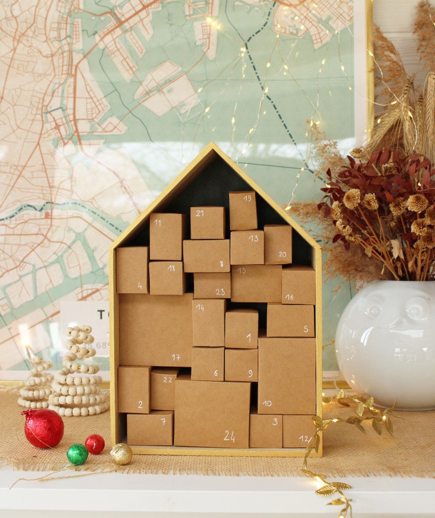 Cette année, j’ai opté pour de l’upcycling en réutilisant un objet déjà présent dans ma déco : une boitte en bois en forme de maison. Elle fut le point de départ de ma réflexion pour ce projet DIY. L’option des minis boîtes s’est naturellement présentée, alors ni une ni deux, je me suis lancée dans la création de cette version cartonnée du calendrier de l’Avent.