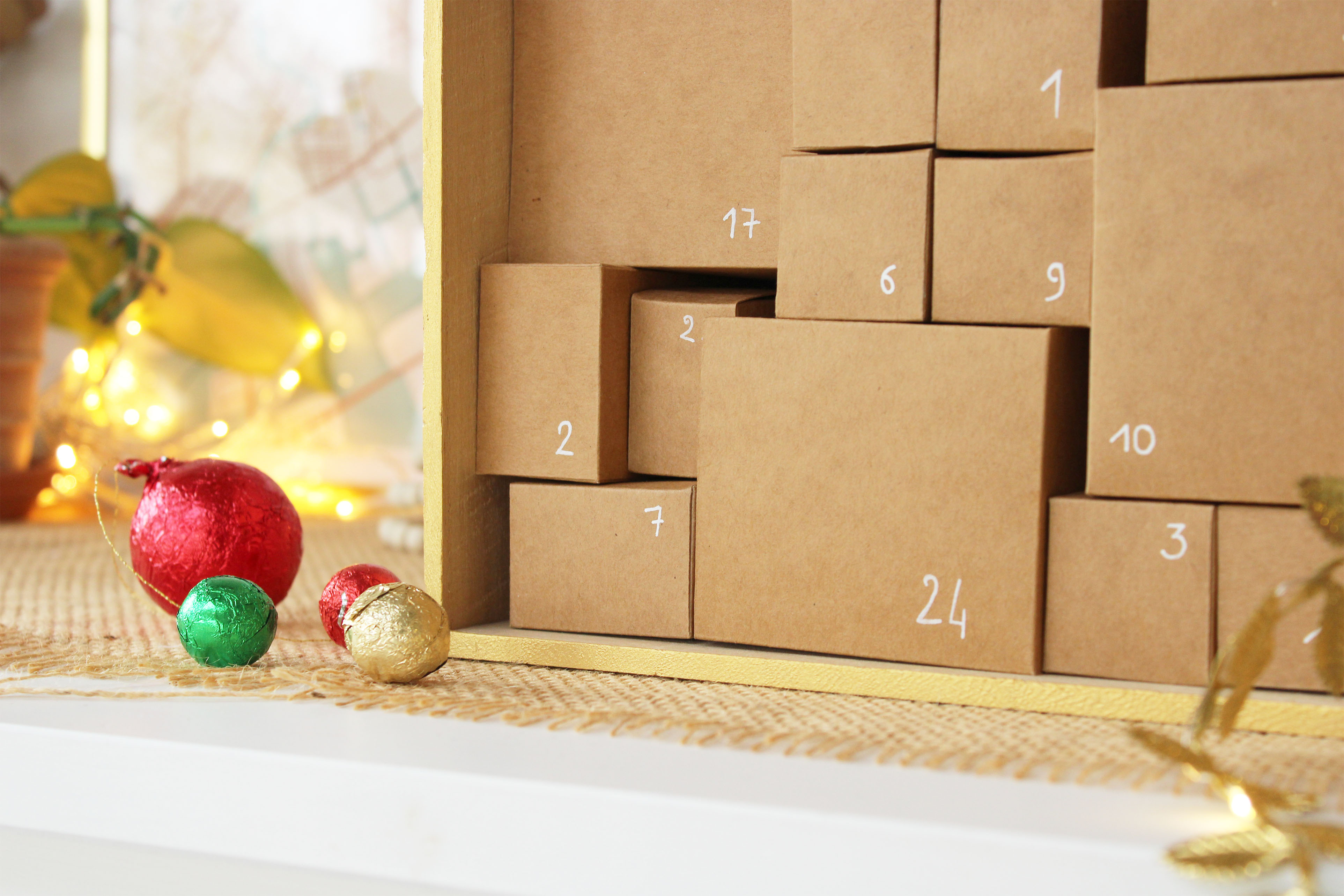 3. Montez les boîtes à l’aide de l’adhésif double face puis numérotez-les de 1 à 24 à l’aide d’un crayon blanc.