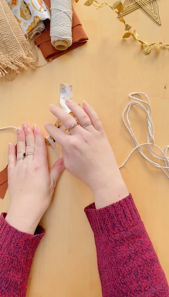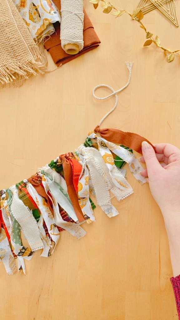 2. Prenez chaque morceau de tissu et nouez-le sur la corde. Pour cela, pliez le morceau de tissu en deux et passez les extrémités dans la boucle, en laissant la corde passer à l’intérieur.