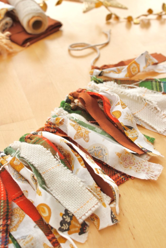 1.Commencez par couper des morceaux de tissus de 20 cm par 2 cm. Les dimensions sont bien sûr adaptables selon la largeur de guirlande souhaitée.