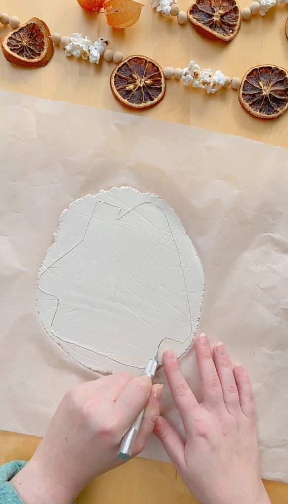 1. Commencez par placer une boule d’argile entre 2 feuilles de papier cuisson et aplatissez-la à l’aide d’un rouleau à pâtisserie.