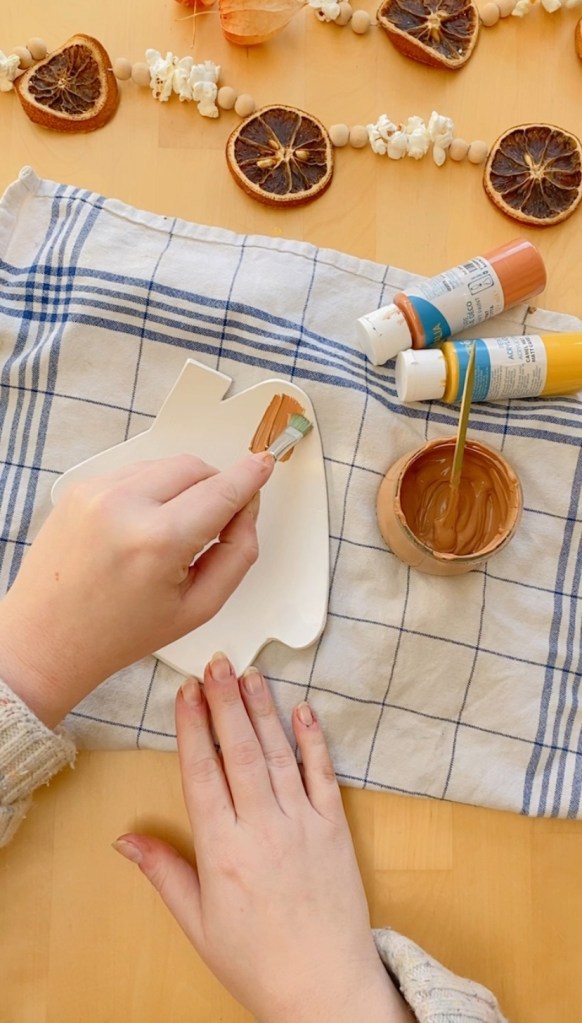 5. Passez ensuite à la peinture. J’ai appliqué 2 couches de couleur « pain d’épices » sur le recto et le verso avant de faire les détails en blanc.