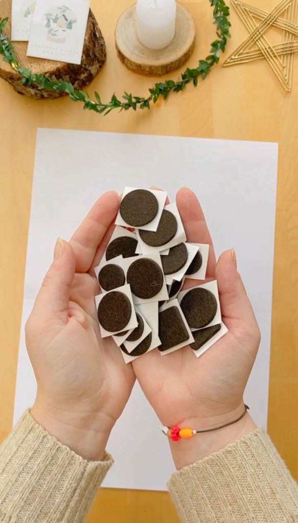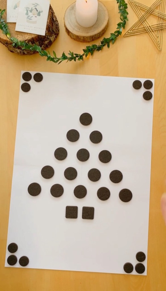 1. Commencez par coller les différents tampons de chaises sur la feuille. J’ai opté pour une forme de sapin avec quelques détails dans chaque coin du tableau.
