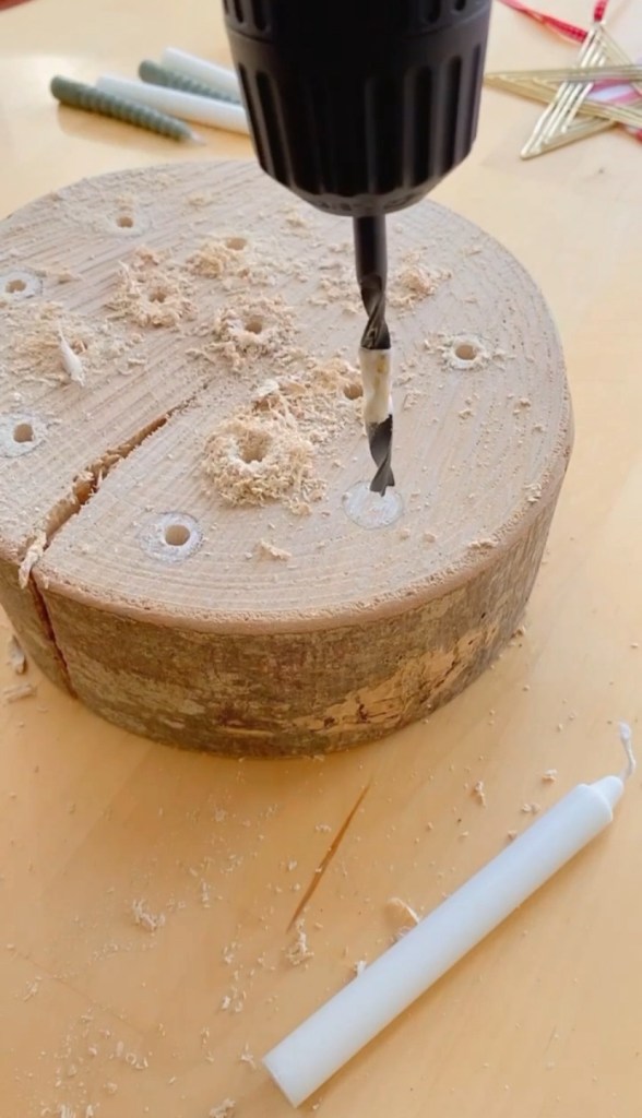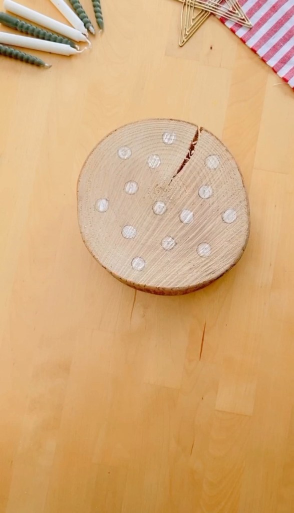 2. Tracez ensuite l’emplacement des bougies sur la surface du rondin de bois en contournant le diamètre de la bougie. Vous aurez ainsi la taille de la largeur des trous nécessaires pour y insérer les bougies.